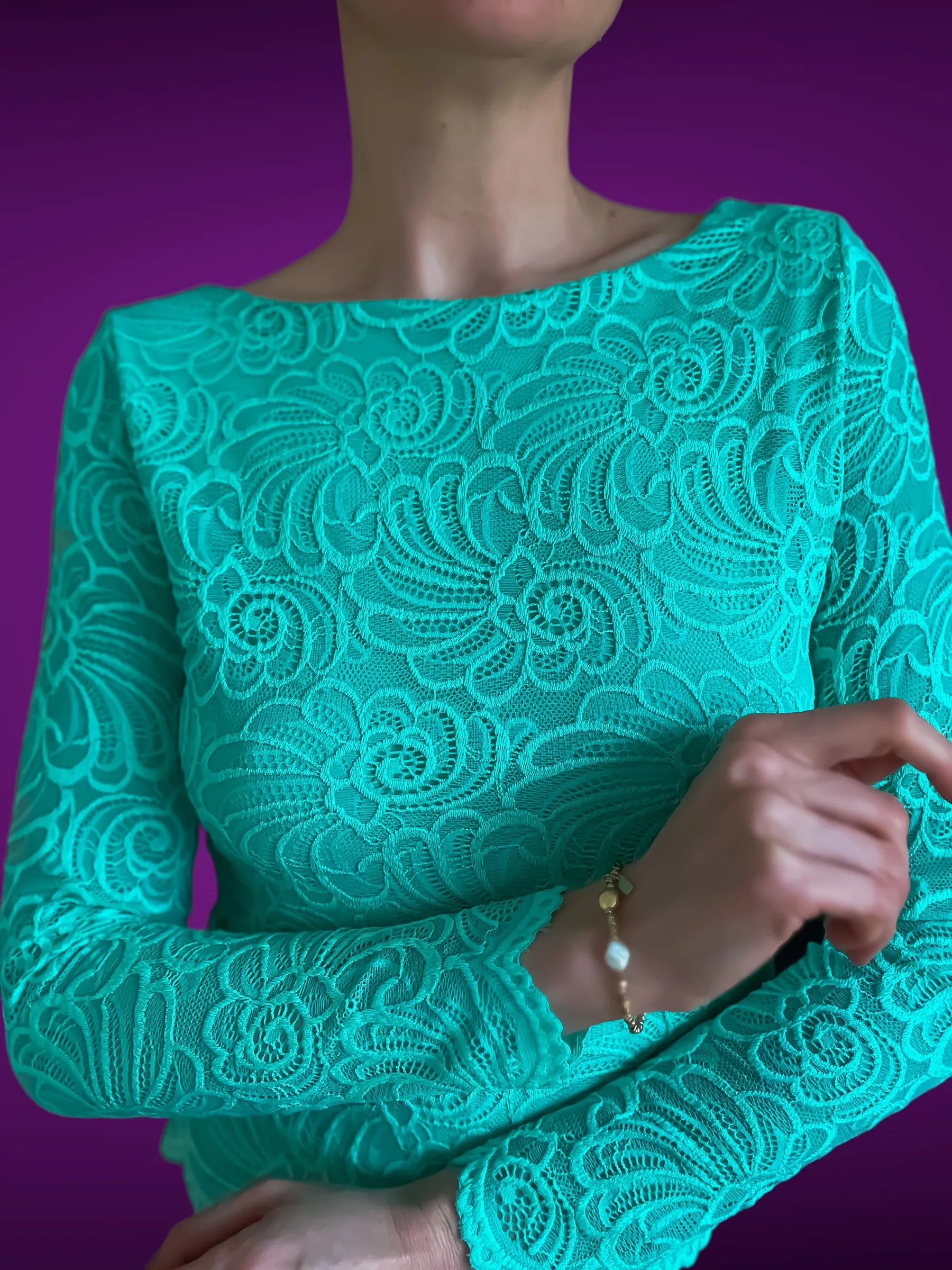 Haut en dentelle exclusif avec doublure en jersey doux. Manches longues élégantes, effet transparent délicat et silhouette féminine. Confortable, il est parfait pour danser comme pour une soirée.