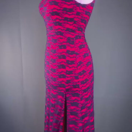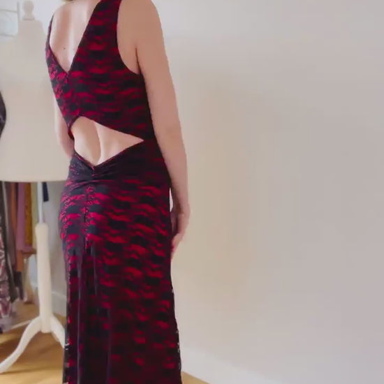 An exclusive dress, crafted from black elastic lace layered over a vibrant red jersey lining. The contrast between the sheer lace and the bold underlayer creates a striking, seductive look while remaining elegant and refined. The fitted silhouette flows into a straight skirt with a back slit for movement. A unique cut-out detail at the waistline on the back adds a modern twist. Available in size S only.