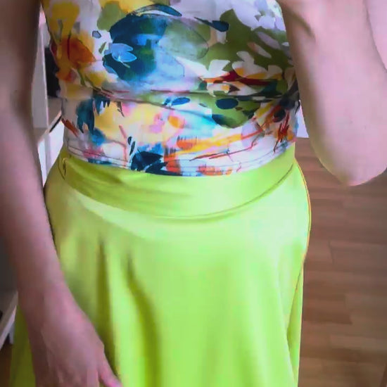 For your tango evenings and special occasions, this bright and elegant tango wrap skirt is designed to make you feel light and confident with every step. The lightweight satin with a soft sheen catches the light beautifully, while the vibrant lime-green color fills your look with freshness, energy, and a joyful summer vibe. This skirt draws attention effortlessly and radiates a lively, sunny mood.