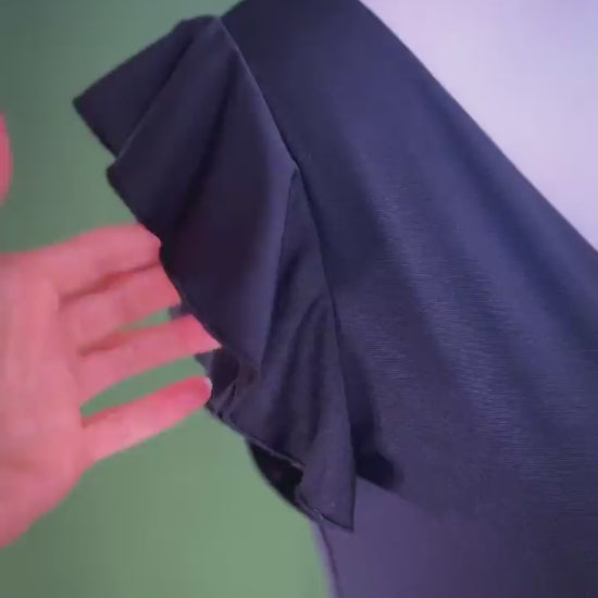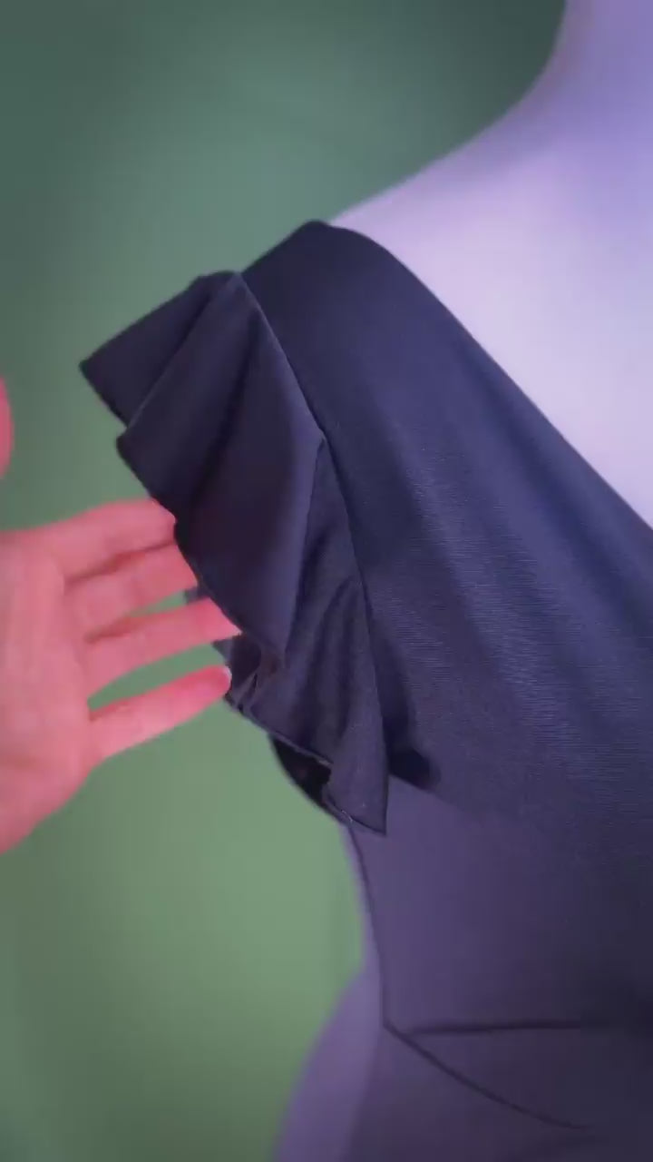 Chic tango dress in classic black, featuring delicate flutter sleeves that add a touch of charm. Fully lined for comfort and structure, with a subtle back slit for graceful movement. With its 90 cm length, this dress strikes the perfect balance between elegance and playfulness — making it a versatile piece for the dance floor and beyond. Pair it with a flowing silk chiffon skirt for an elevated layered look.