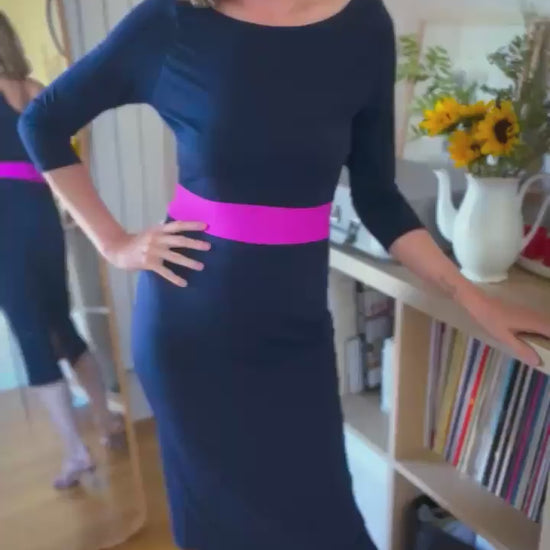 An elegant and versatile dress crafted from soft stretch fabric with a bright waistband accent. The classic dark blue shade makes it timeless, while the fitted silhouette with a ¾ Sleeve and semi-open back adds sophistication. Designed with a lining for comfort, it gracefully covers bra straps and ensures a smooth fit. A back slit at the hem allows freedom of movement and ease of step. Perfect for tango practices, milongas, or styled effortlessly for everyday wear. Limited Edition