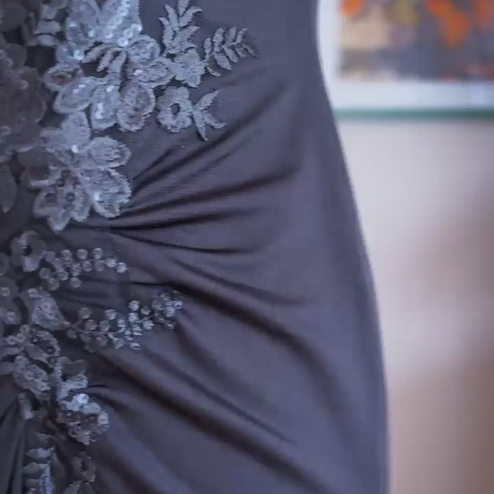 A subtle drape with shimmering embroidery at the hip adds a sophisticated accent and catches the light in motion.