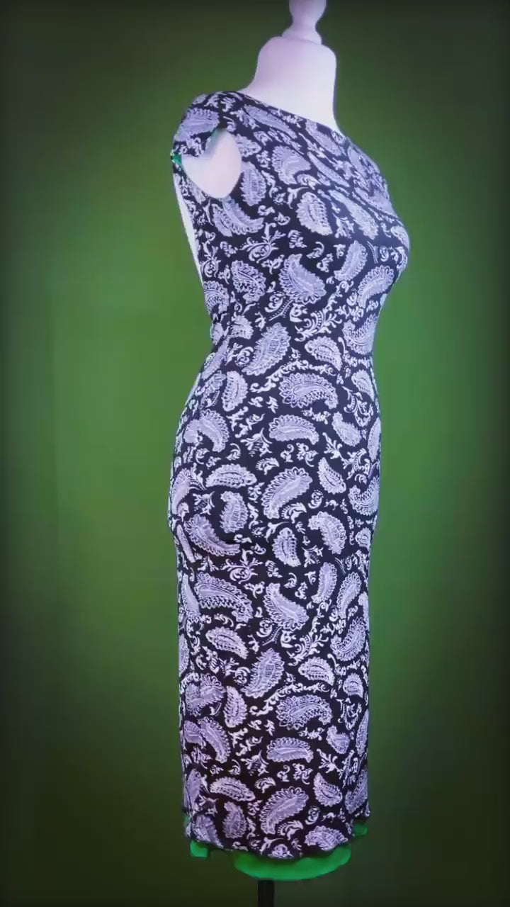A refined two-layer tango dress with a striking contrast. The green underlayer subtly peeks out from the hem, creating a unique and elegant accent. The open back adds allure, while the shoulders and underarms remain fully covered for comfort and confidence. A fitted silhouette enhances femininity, and the slit at the back ensures ease of movement.