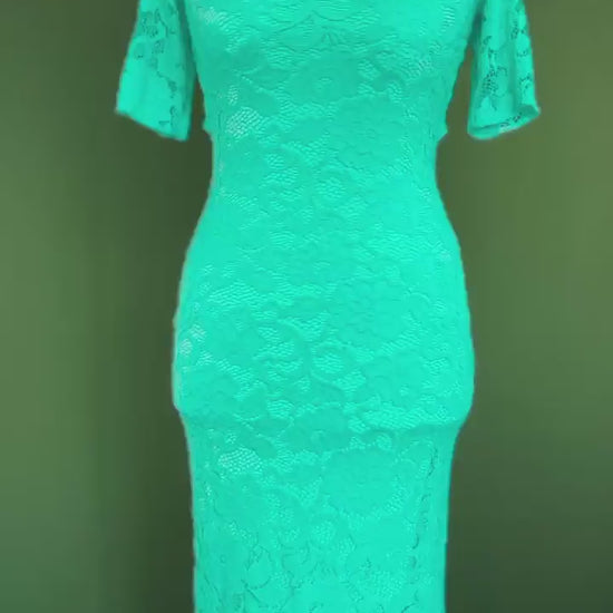 An exquisite and unique lace dress in a captivating Tiffany shade, crafted with a soft lining for comfort and elegance. The floral lace delicately follows the silhouette, while the refined midi length creates a graceful and feminine look. Featuring a cutout back detail, the dress combines sophistication with a hint of allure. This one-of-a-kind piece is perfect for tango evenings, festive occasions, or any special night out.