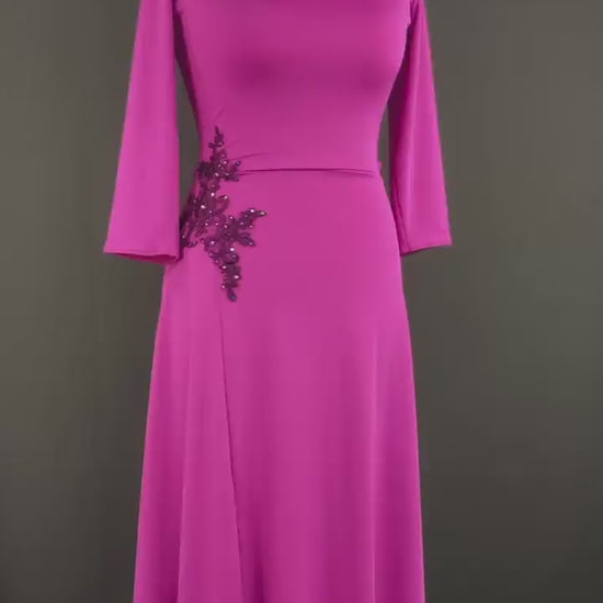 An exclusive tango dress in a cool rose shade, crafted from silky flowing jersey that gracefully follows movement. The fitted bodice with three-quarter sleeves highlights the elegance of the upper silhouette, while the wide skirt with a back godet creates a sense of drama and freedom in motion. A side slit adds allure, and the shimmering embroidery detail at the waist catches the light with every step. Perfect for those who want to combine refinement, femininity, and performance presence.