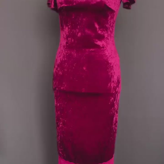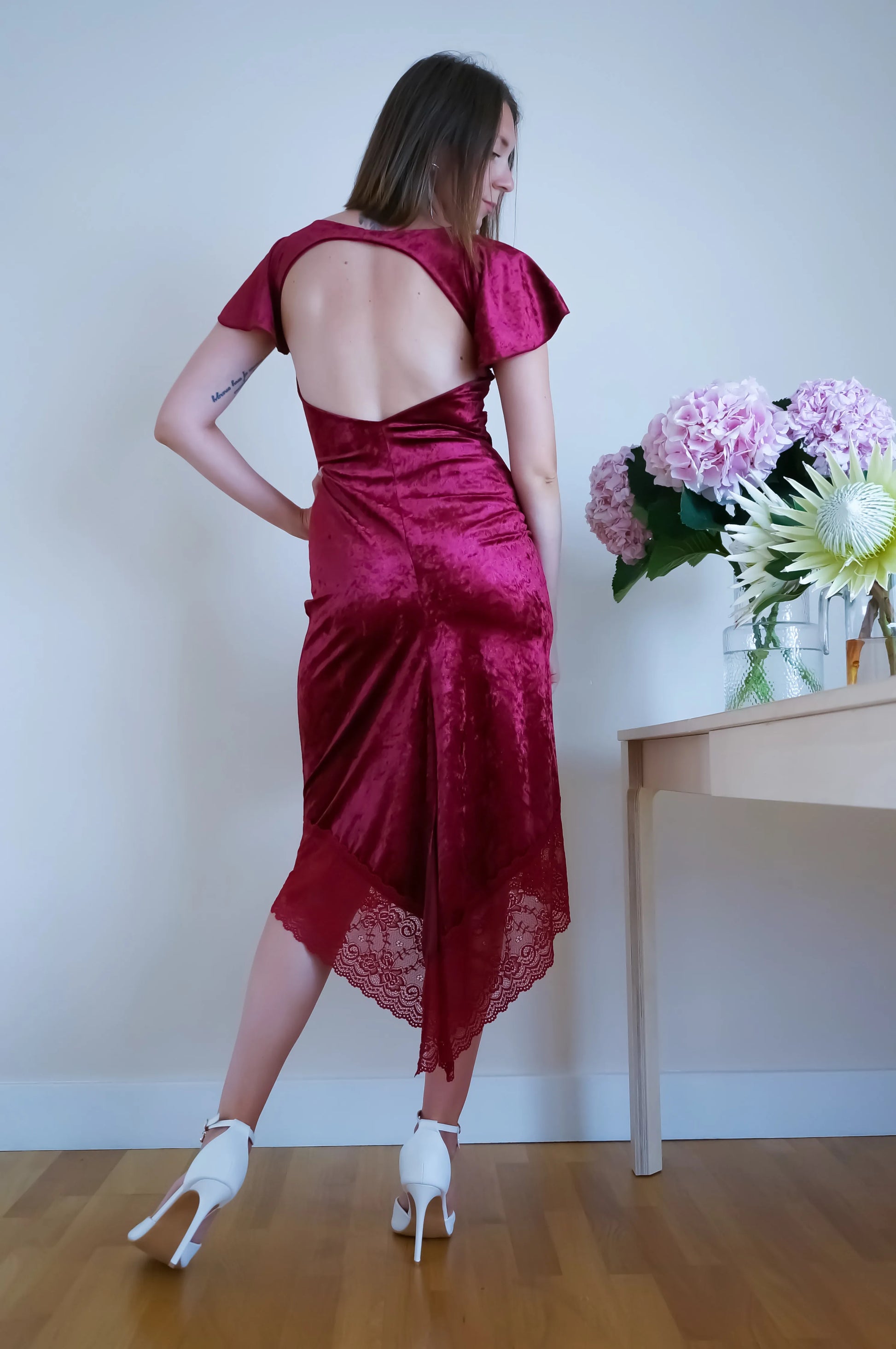 Deep burgundy velvet tango dress with flutter sleeves and open back