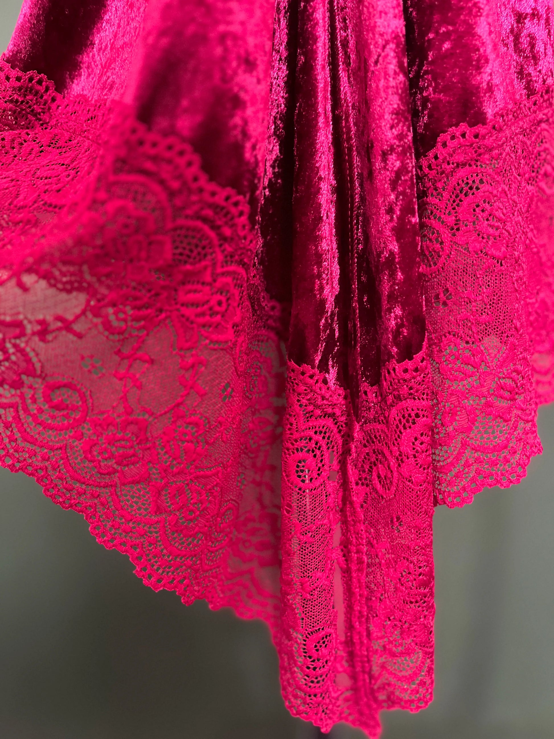 An exclusive tango dress in a deep burgundy shade, crafted from silky marble velvet with a delicate sheen. The fitted bodice is lined for comfort, while flutter sleeves add a touch of softness to the silhouette. The open back design enhances femininity, and the elongated hemline at the back brings drama and movement with every step. A wide lace trim adorns the hem, creating a refined and romantic finish. Perfect for tango dancers who appreciate elegance with a hint of allure.