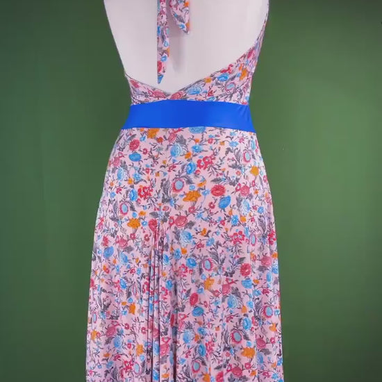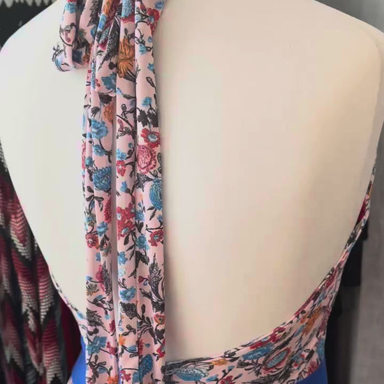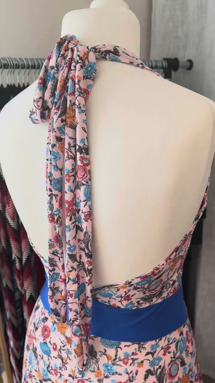 A delicate and feminine dress crafted from silky, flowing jersey with a soft drape that enhances every movement. The halter neckline ties gracefully at the back, highlighting the shoulders and back. The bodice is lined for comfort and support, while the skirt falls into an A-line with a gentle flare, finished with a lace trim at the hem for an extra touch of charm. Designed in a colorful floral print with a contrasting waistband for definition. Available in size M only, one exclusive piece.