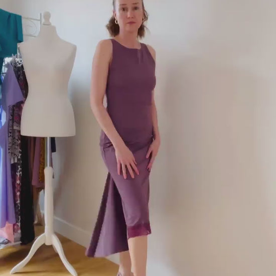 Striking tango dress in a dusty violet shade, designed to make an impression on and off the dance floor. The back features a dramatic flared tail with delicate lace trim, adding both movement and sophistication. A bold cut-out at the back ensures a touch of allure while cleverly covering the bra strap for confidence and comfort. One of a Kind — Size S