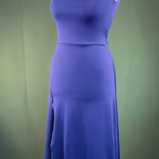The front features a thigh-high slit, while the back reveals a dramatic elongated hem for graceful movement. A sculpted cut-out detail at the back adds intrigue, cleverly designed to conceal bra straps — allowing the dress to be worn confidently with lingerie.