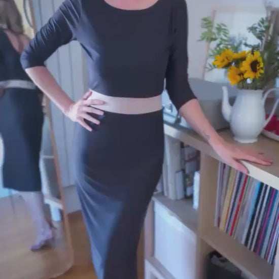 An elegant and versatile dress crafted from soft stretch fabric with a beige waistband accent. The classic brown shade makes it timeless, while the fitted silhouette with a ¾ sleeve and semi-open back adds sophistication. Designed with a lining for comfort, it gracefully covers bra straps and ensures a smooth fit. A back slit at the hem allows freedom of movement and ease of step. Perfect for tango practices, milongas, or styled effortlessly for everyday wear. Limited Edition