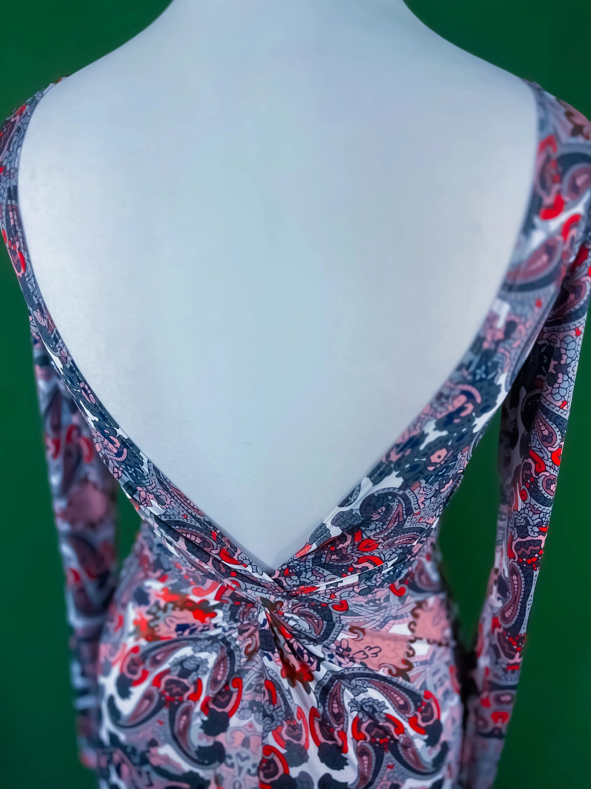 An elegant and striking knit dress designed to highlight movement and temininity. The bodice is delicately lined for comfort, while the fitted silhouette flows into a graceful midi length. At the back, a deep V-shaped neckline with a chic knot detail creates a dramatic focal point, complemented by a back slit that ensures ease in motion. A unique piece that balances sophistication with allure — perfect for tango, evening occasions, or special events. Only one available.