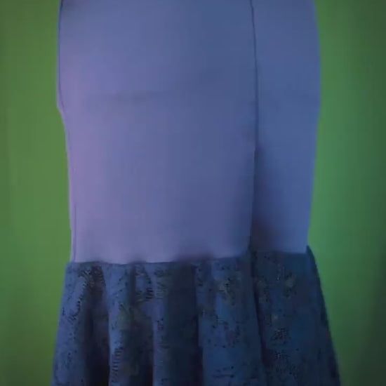 Elegant tango skirt in deep navy blue, crafted from textured jersey that holds its shape beautifully without the need for lining. Designed with a wide high waistband that flatters and supports the waistline. The hem is finished with a voluminous lace flounce, adding graceful movement and feminine charm. One of a Kind — Size M