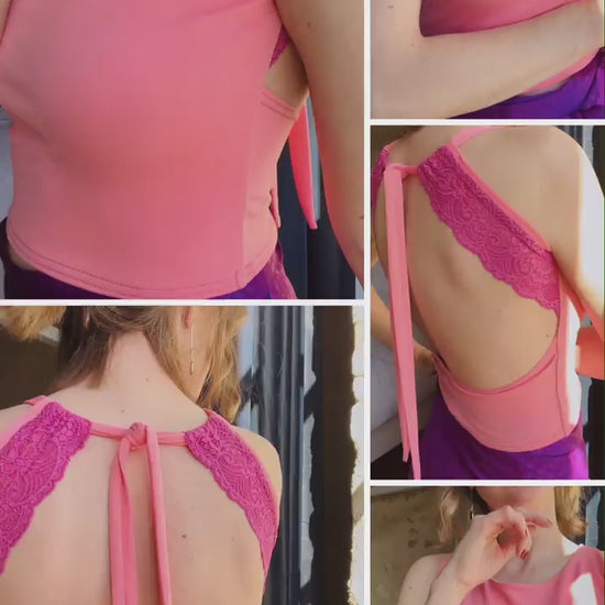 A delicate top crafted from soft stretch fabric in a romantic pink shade, featuring refined lace straps at the back. The tie fastening at the neck allows for an adjustable fit, while the smooth front design keeps the silhouette sleek and elegant. With its teminine charm and comfortable stretch, this piece is both versatile and eye-catching. One of a kind - Size S
