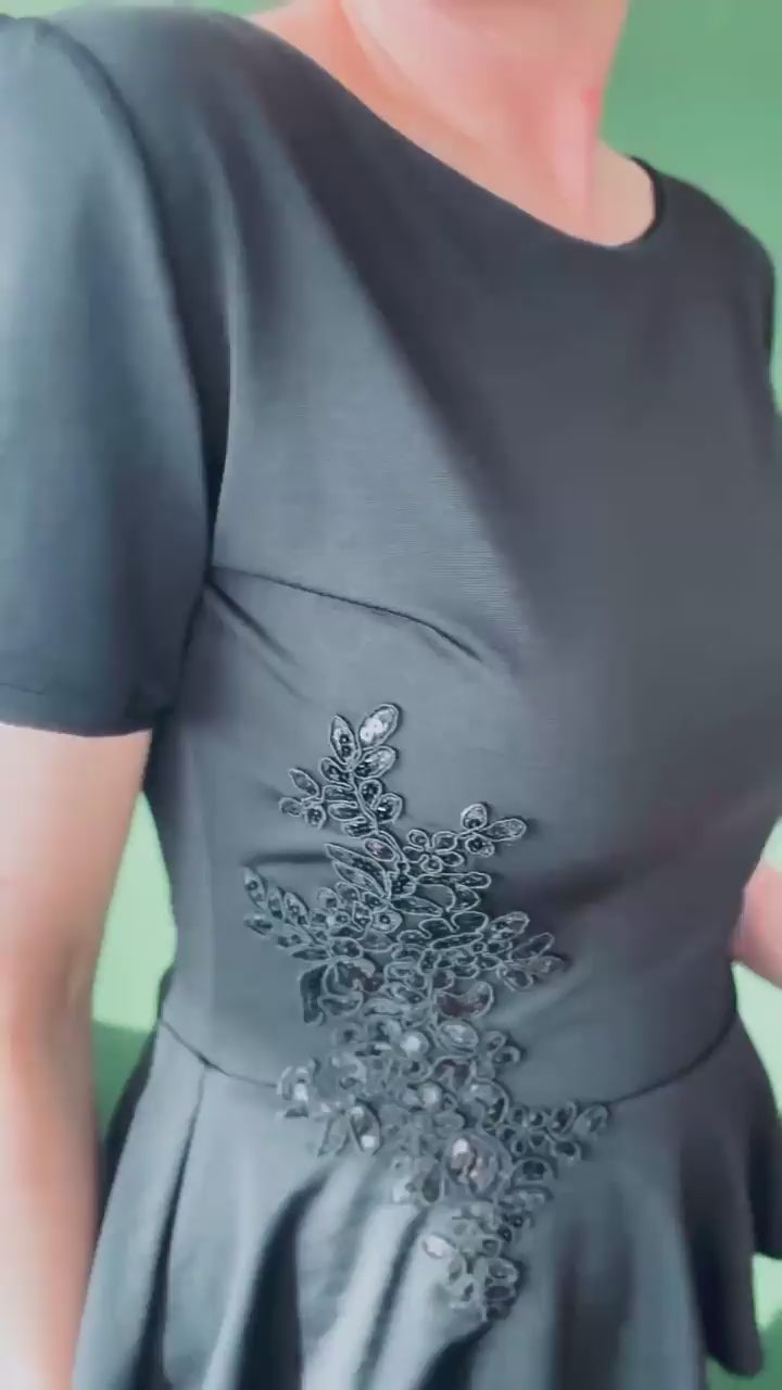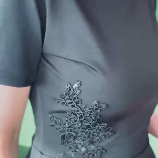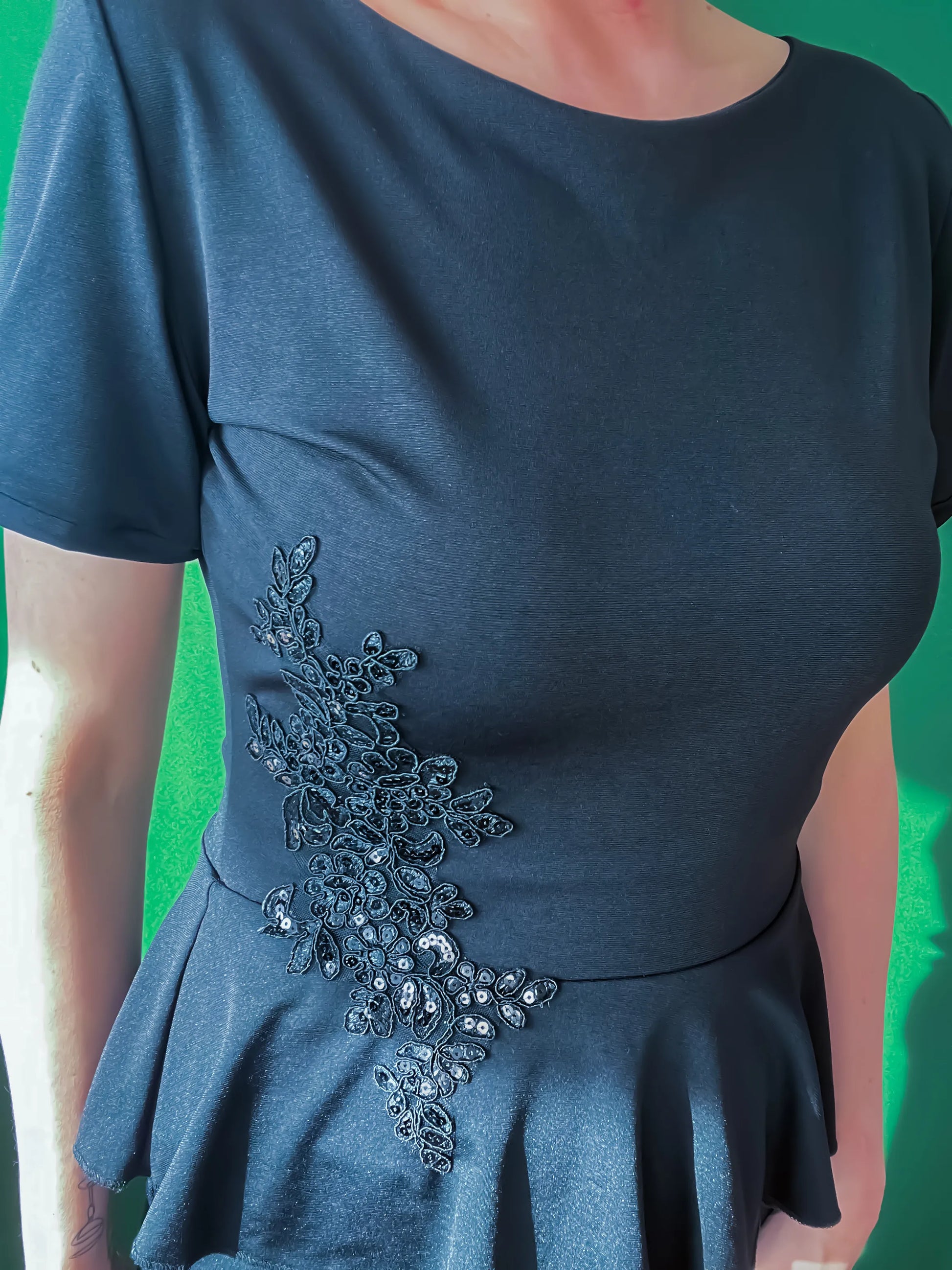 Exclusive top made of silky jersey with lining. Decorated with shimmering embroidery at the waist. The feminine basque not only adds elegance but also gently masks the tummy. A perfect piece for both dancing and special occasions.