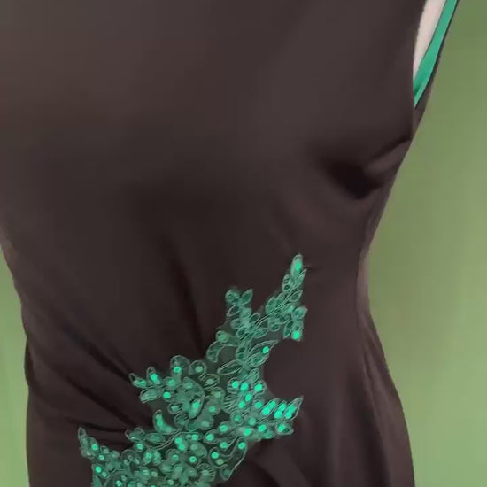 The shimmering embroidered accent at the waist enhances the draping effect, while the contrast of deep black over vibrant green jersey creates a striking look. With its closed shoulders and refined silhouette, this dress is perfect for tango, evening outings, or special occasions.