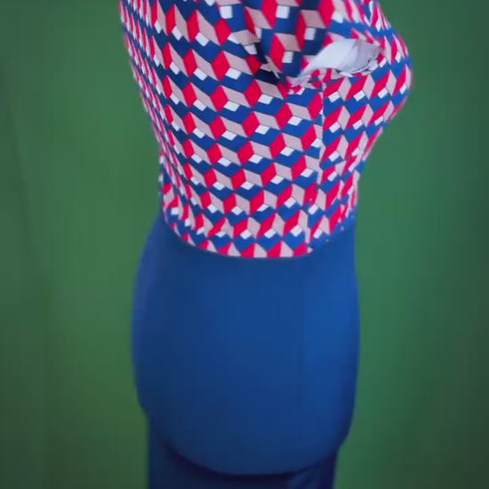 An exclusive tango dress with a playful geometric print bodice and sleek fitted skirt. The semi-off-the-shoulder neckline with short sleeves creates a flattering décolleté, while the stretch jersey skirt with lining ensures both comfort and elegance. A back slit provides freedom of movement, making this piece versatile enough to wear not only for dance but also for everyday chic.