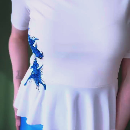 Exclusive white top crafted from silky stretch jersey with lining for comfort. Decorated with delicate blue embroidered fish motits that add originality and charm. The peplum hem highlights the waist, creating a graceful and feminine silhouette. Fits perfectly for both elegant and casual looks.