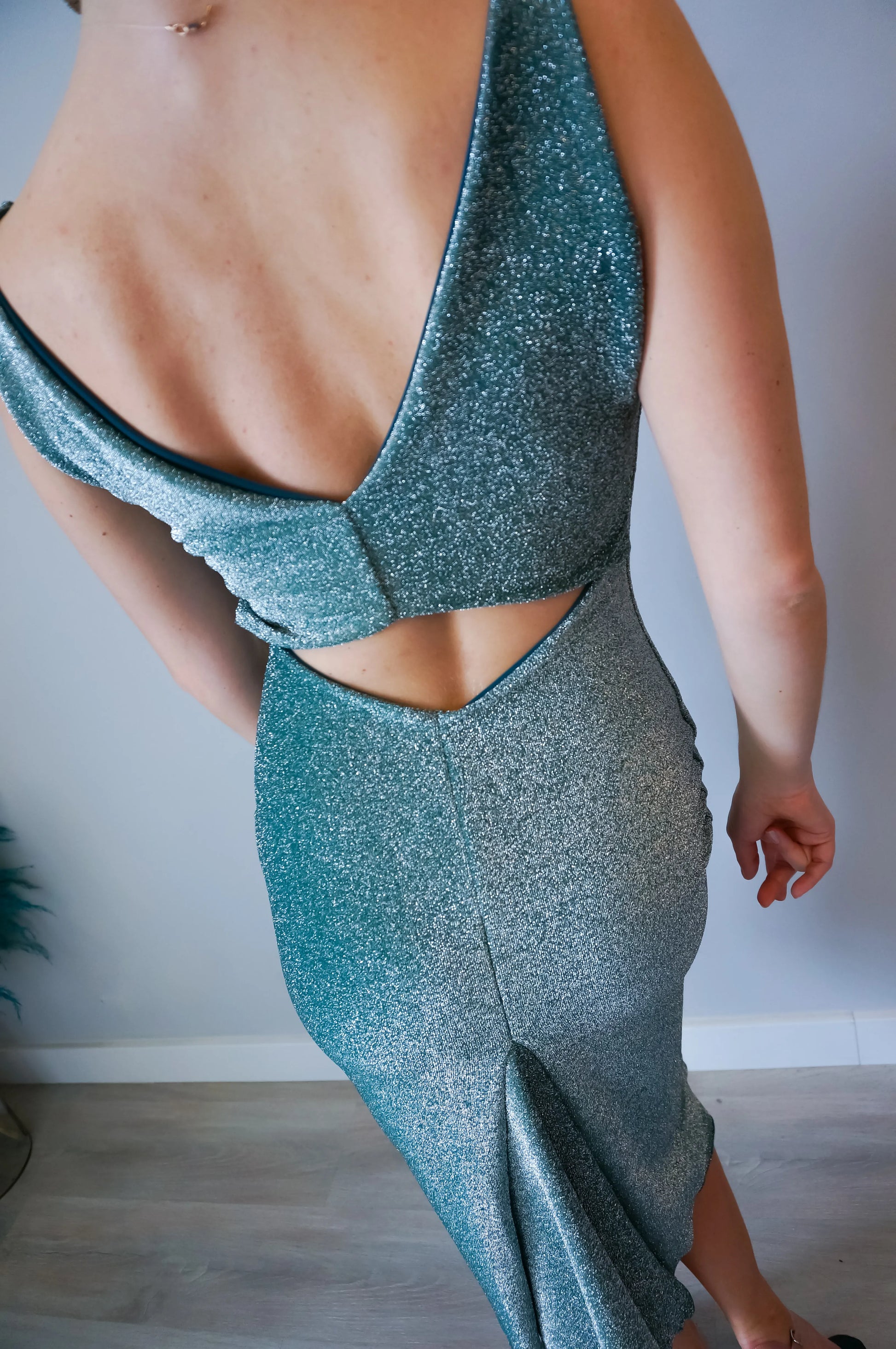 An elegant and captivating dress crafted from shimmering knit fabric, tully lined for comfort and a flawless fit. The figure-hugging silhouette flows into a graceful flared hem, creating refined movement with every step. At the back, a deep V-shaped neckline with a cut-out detail adds a touch of allure. A unique one-of-a-kind piece, designed to shine at tango evenings, festive events, or special occasions.