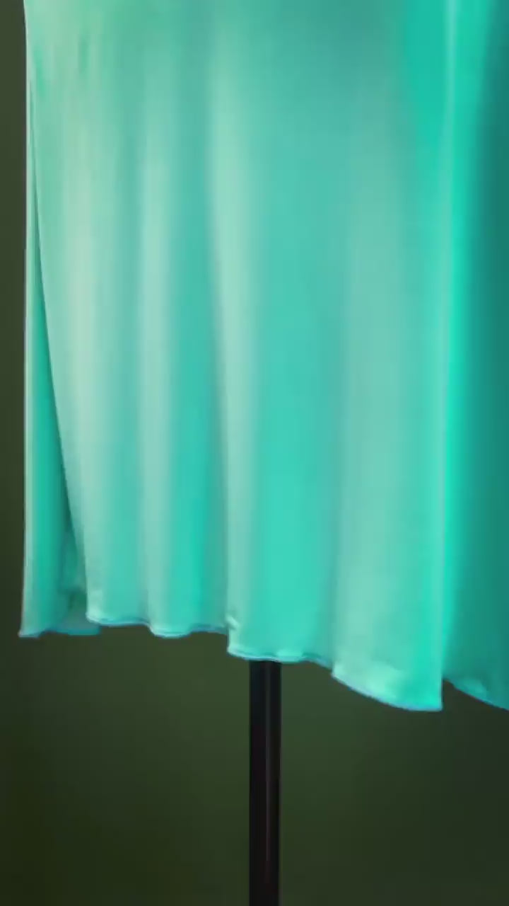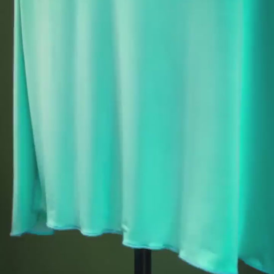 An exclusive tango dress in a Tiffany shade, crafted from silky flowing jersey with a fitted bodice that features an elastic mesh overlay on the top. The mesh is fully lined, while the elbow-length sleeves remain sheer, adding a touch of elegance and lightness. The back godet creates beautiful volume and fluidity in movement, while the front slit adds a graceful allure. The sophisticated Tiffany color makes this dress a statement piece, combining refinement and femininity.