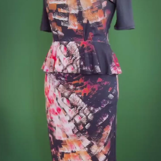 An exclusive peplum top crafted from soft viscose, fully lined for comfort and perfect for sensitive skin. The artistic print adds character, while the fitted waist and flowing peplum create a flattering feminine silhouette. Ideal for pairing with skirts or trousers for both elegant and casual occasions.