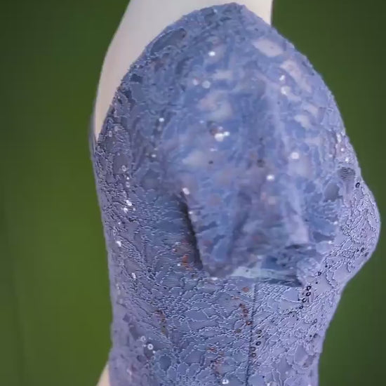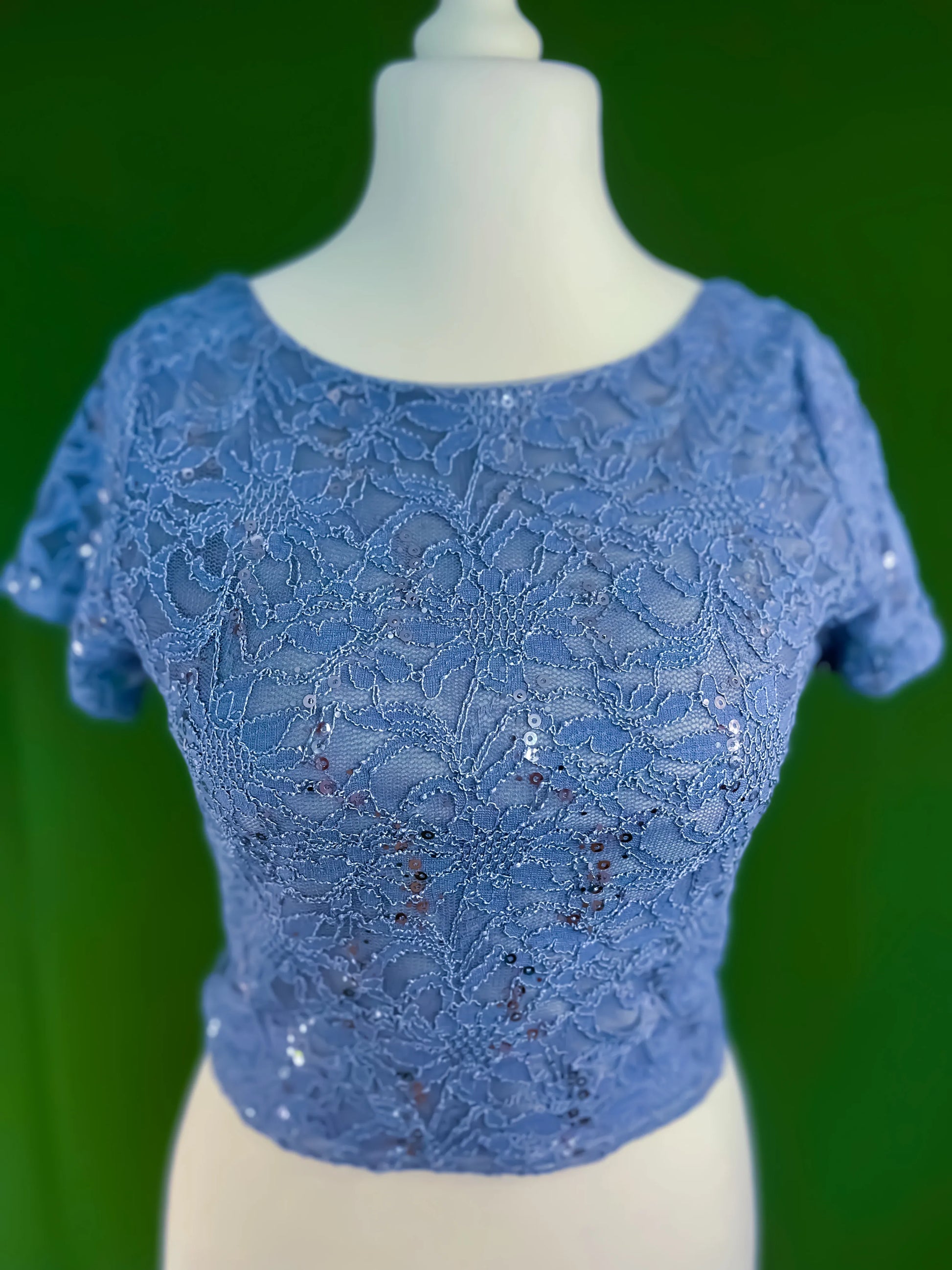 Soft shimmering lace top, lined for comfort and elegance. Features short sheer sleeves, a semi-open back, and a design that fully covers bra straps — perfect for both practice and performance.