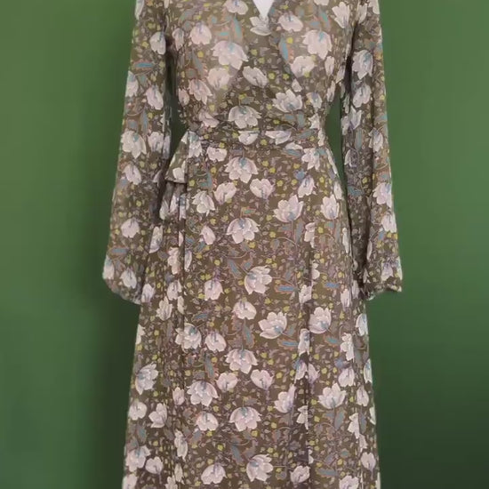 An enchanting dress crafted from lightweight chiffon with a soft lining. The wrap-style bodice and flowing A-line skirt create a graceful silhouette, while the long sheer sleeves add a touch of romance. The elegant green fabric is adorned with a delicate floral print, making this piece truly timeless.