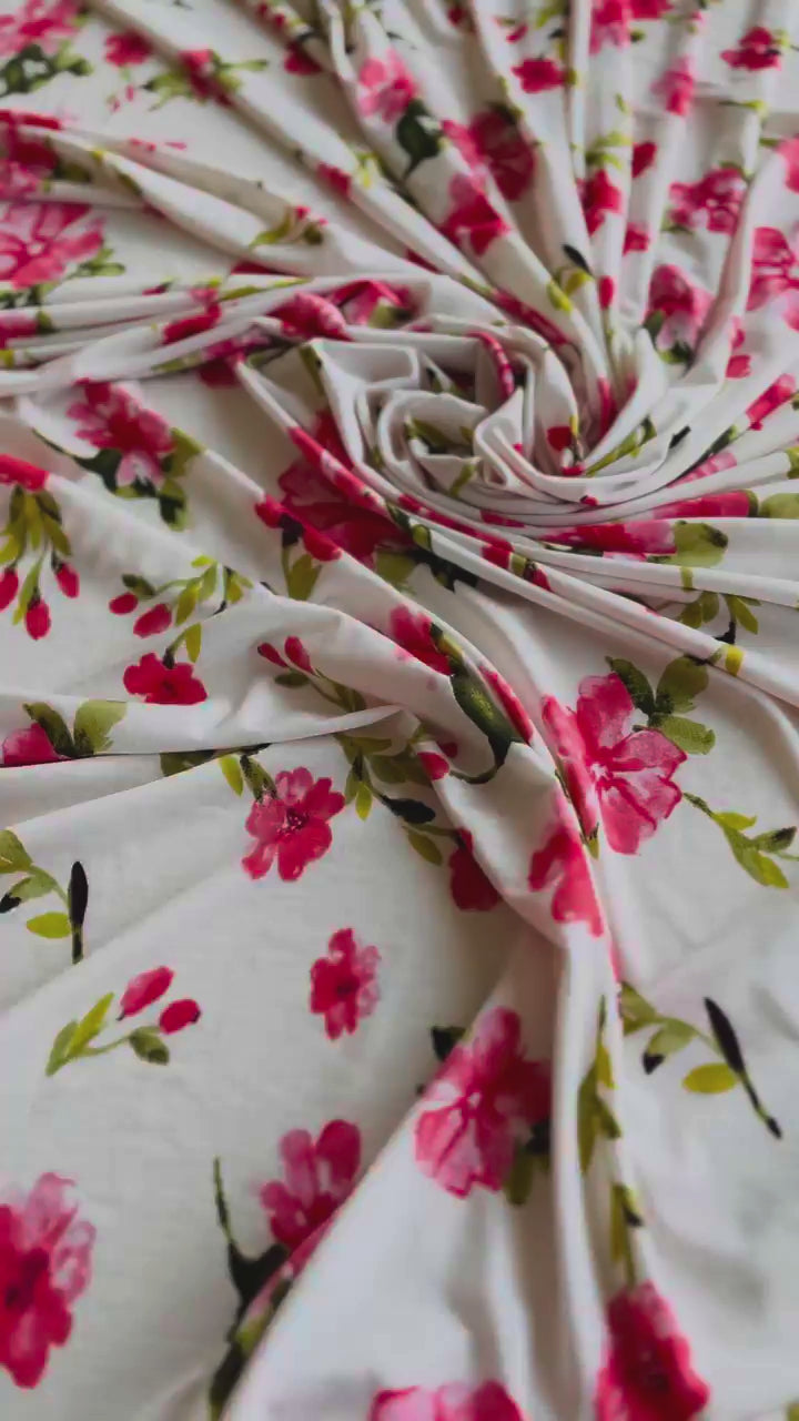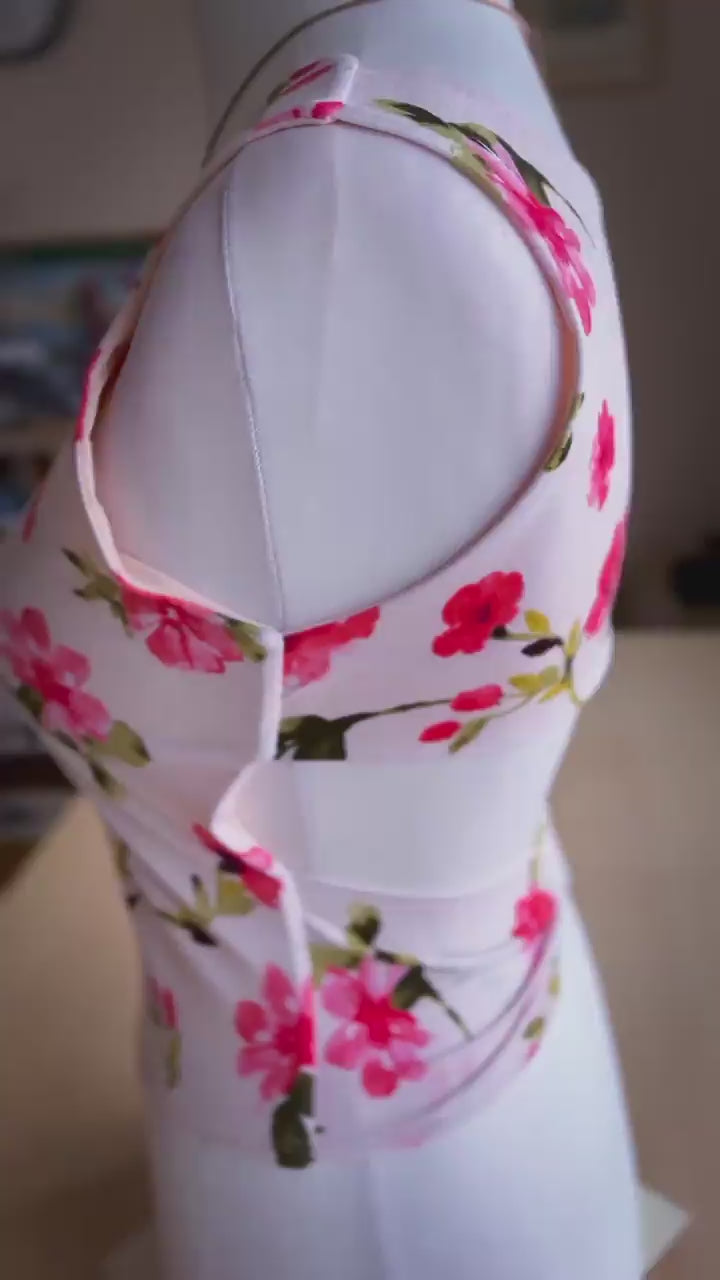 A one-of-a-kind floral top crafted from soft stretch fabric with a smooth lining for extra comfort. Featuring a vibrant pink flower print on a white base, it offers both freshness and elegance. The design includes an open back with a striking cross-strap detail, making it playful yet sophisticated. One of a Kind