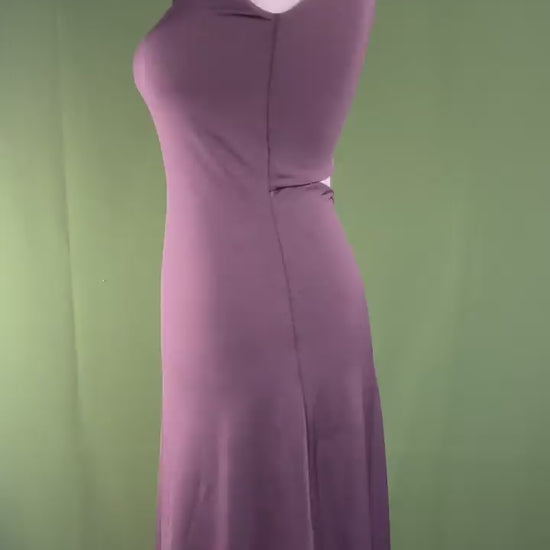 Elegant A-line dress crafted from silky stretch jersey, fully lined for comfort and a flawless drape. The voluminous silk godet at the back adds fluid movement, making every step graceful. A striking cutout at the waistline enhances the design, while the back strap is thoughtfully placed to discreetly conceal bra lines, allowing it to be worn confidently with lingerie.