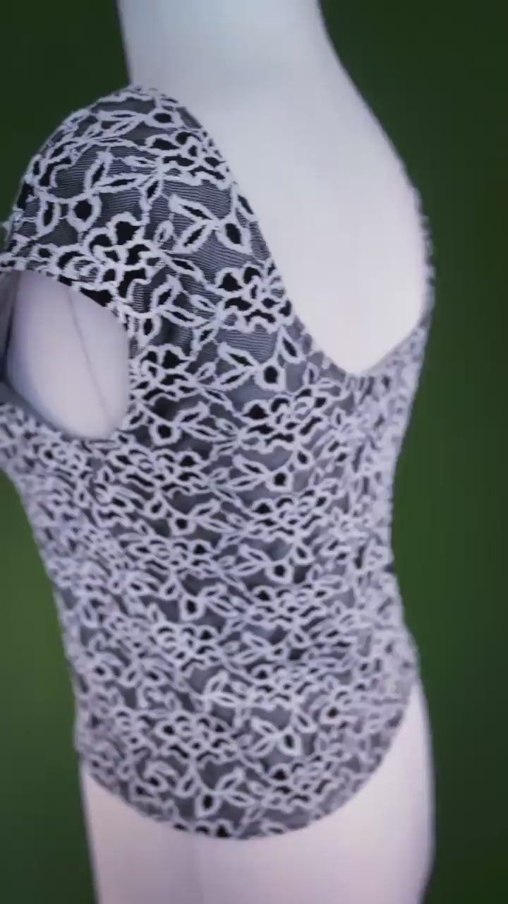Lace tango top in grey. Delicate and versatile, this lace top is designed with a soft lining for comfort, while the closed shoulders and underarms ensure a smooth fit. The semi-open back neckline adds elegance and allows it to be worn with a bra if desired. A refined piece that pairs beautifully with both skirts and trousers for a chic tango look.