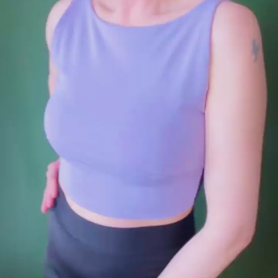 Delicate yet striking, this tango crop top is cratted in a soft lilac jersey with a double-layered front for comfort and support. The back is defined by a wide band of bold violet lace, creating a sensual contrast. A perfect choice for dancing when you want elegance with a modern edge.
