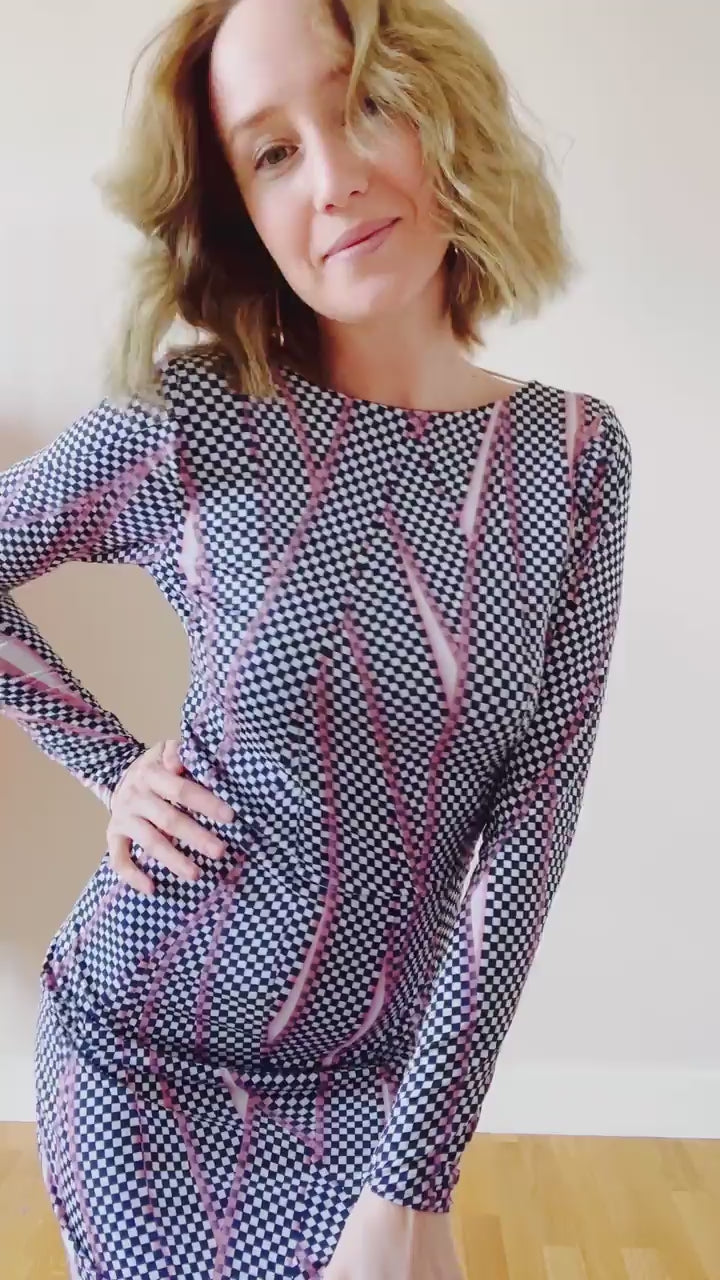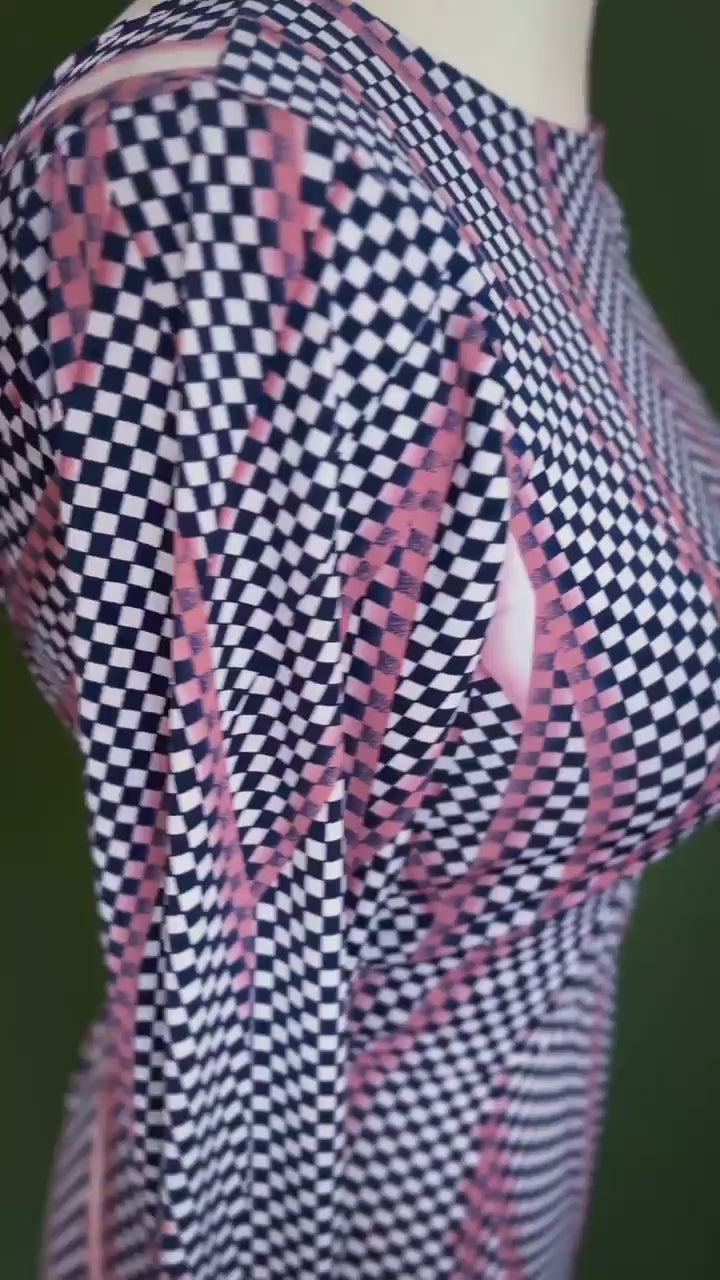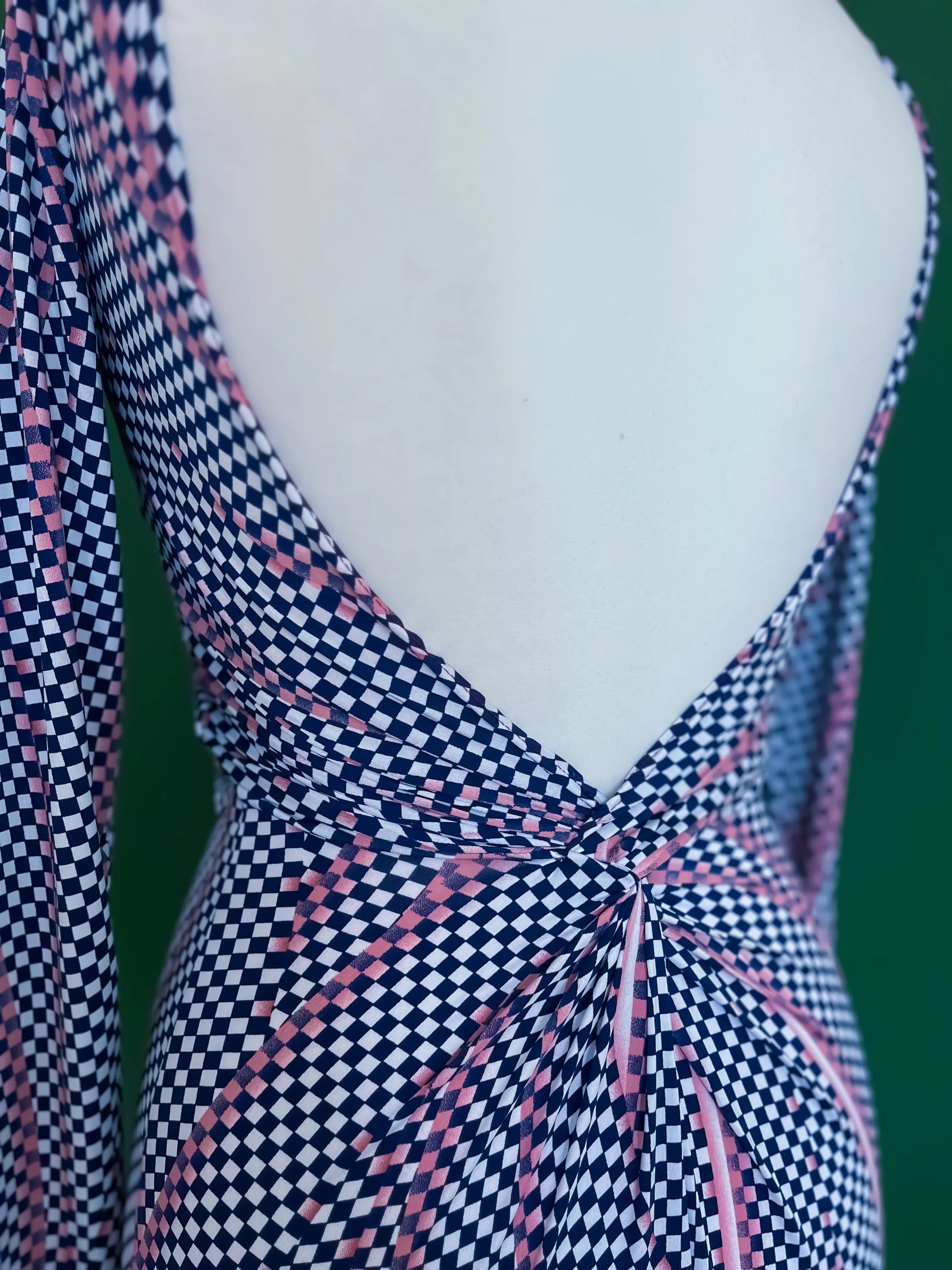 An elegant and striking knit dress designed to highlight movement and temininity. The bodice is delicately lined for comfort, while the fitted silhouette flows into a graceful midi length. At the back, a deep V-shaped neckline with a chic knot detail creates a dramatic focal point, complemented by a back slit that ensures ease in motion. A unique piece that balances sophistication with allure — perfect for tango, evening occasions, or special events. Only one available.