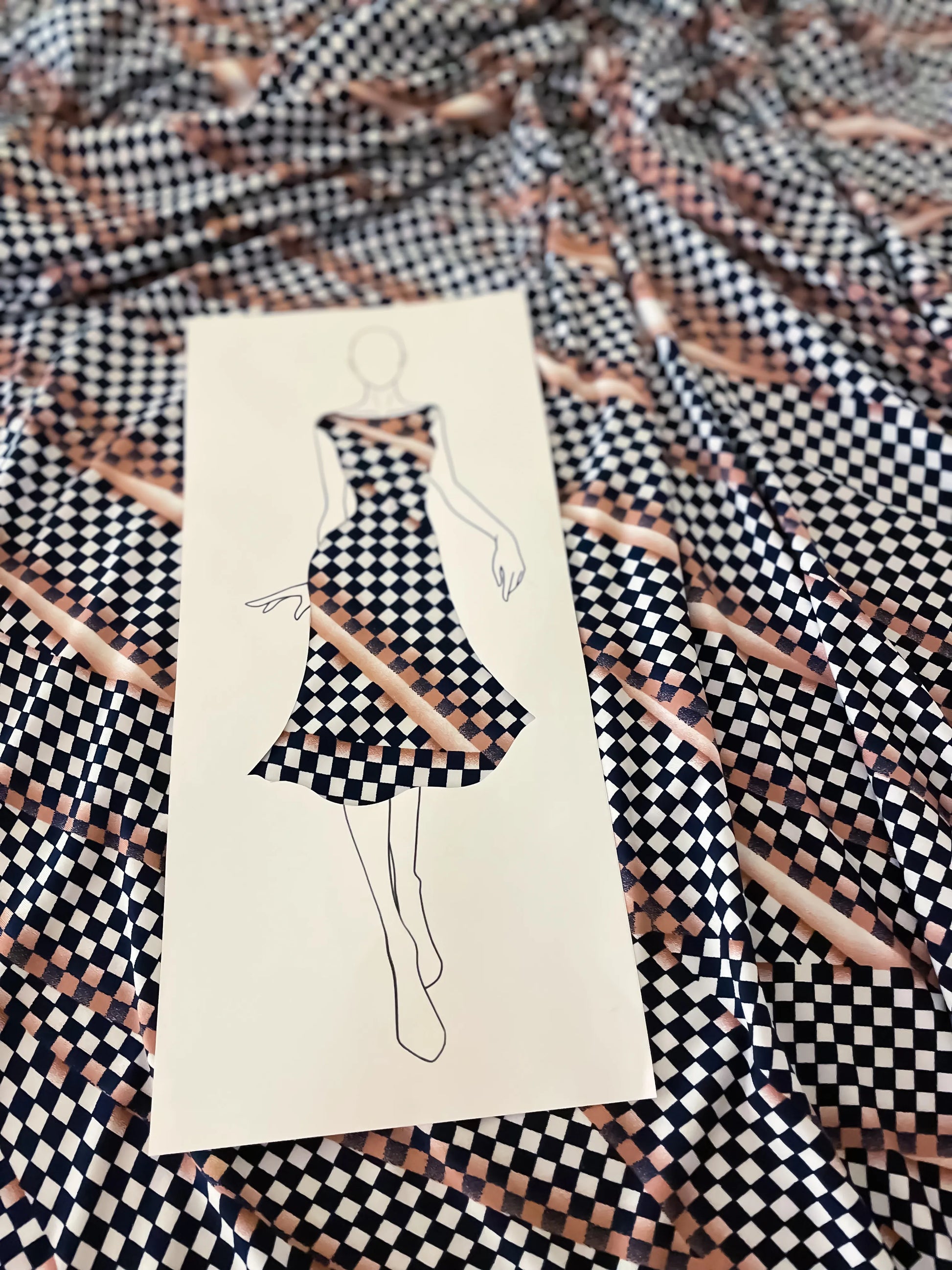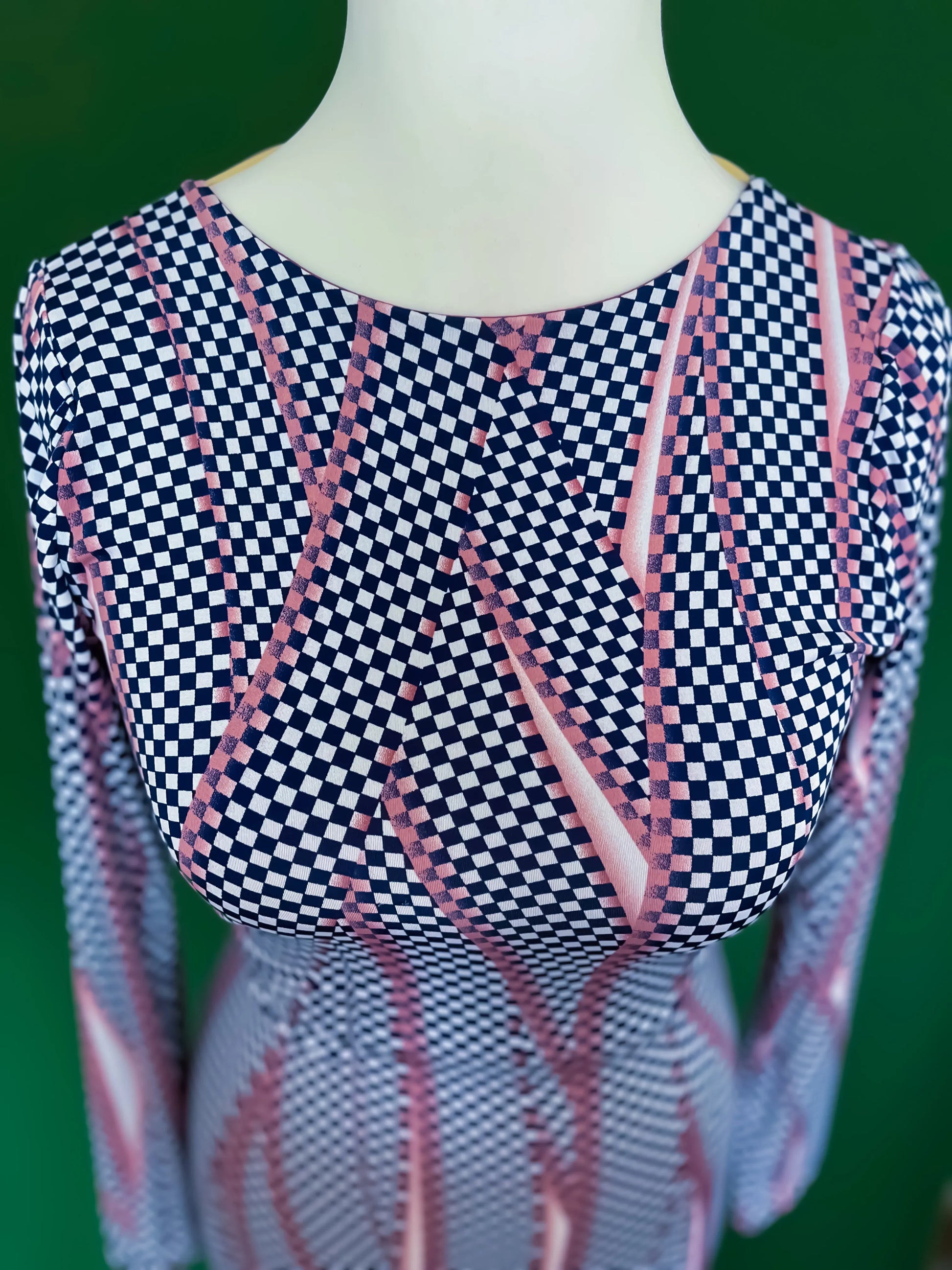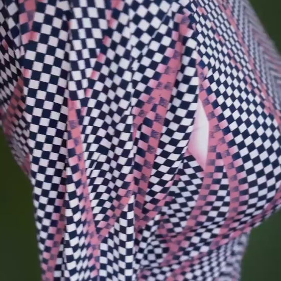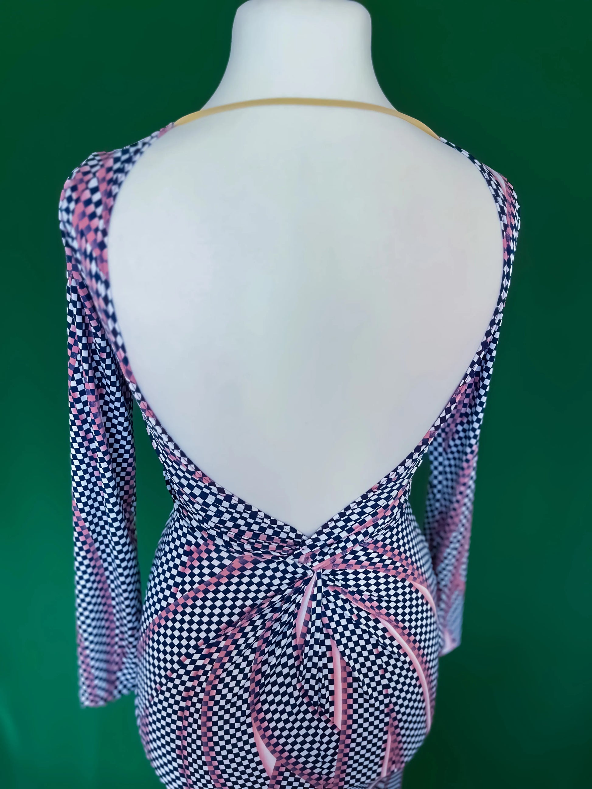 An elegant and striking knit dress designed to highlight movement and temininity. The bodice is delicately lined for comfort, while the fitted silhouette flows into a graceful midi length. At the back, a deep V-shaped neckline with a chic knot detail creates a dramatic focal point, complemented by a back slit that ensures ease in motion. A unique piece that balances sophistication with allure — perfect for tango, evening occasions, or special events. Only one available.
