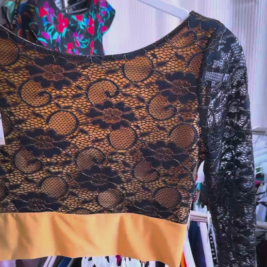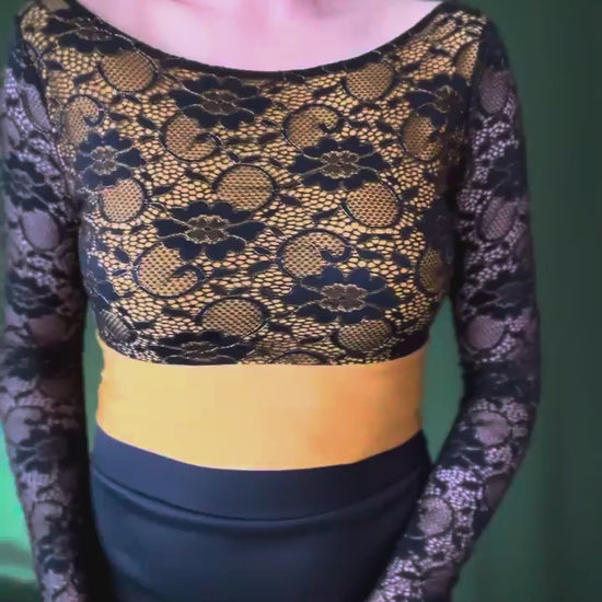 This elegant top combines dark blue lace with golden stitching over a soft jersey base. The fitted cut with long sleeves creates a refined silhouette, while the semi-open back is designed to discreetly cover lingerie straps. A sophisticated and unique piece for tango evenings.