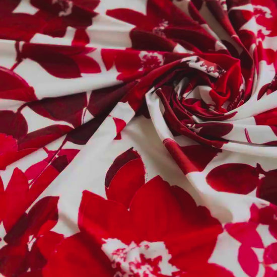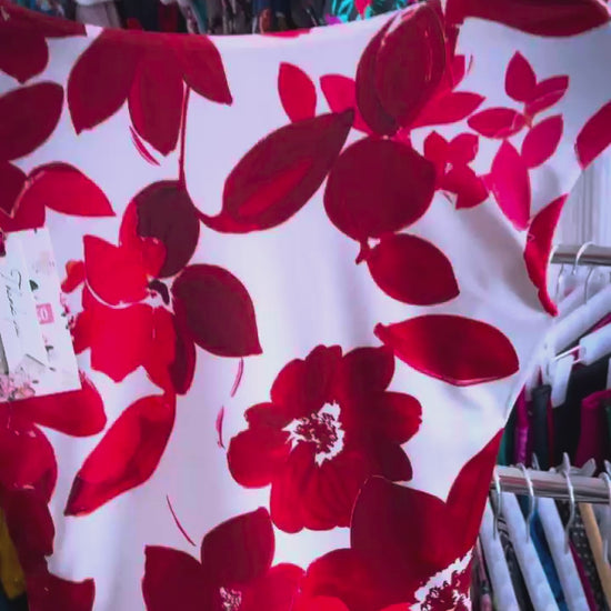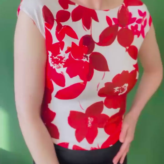 Floral tango top - one of a kind. This vibrant red-and-white top is made from double-layered stretch jersey, offering both structure and comfort. The silhouette features closed shoulders and armholes at the front, contrasted by a dramatic open back for elegance and allure. Fully lined for a smooth fit against the skin.