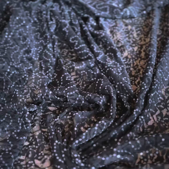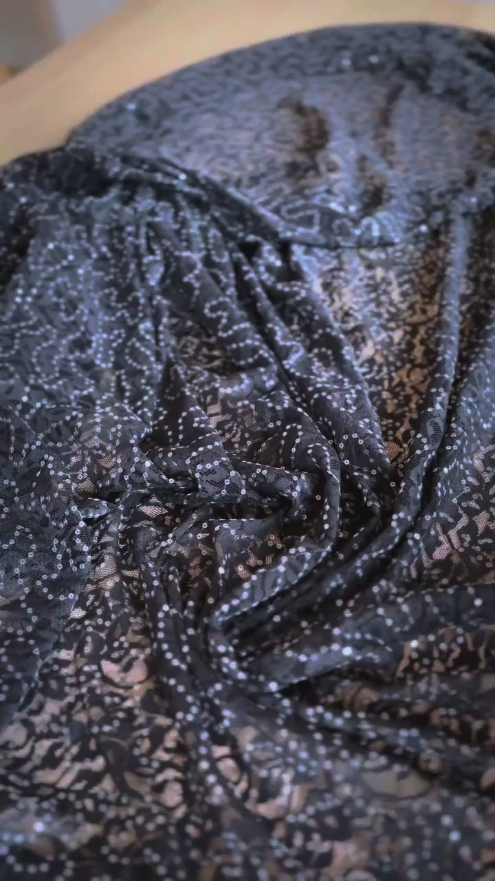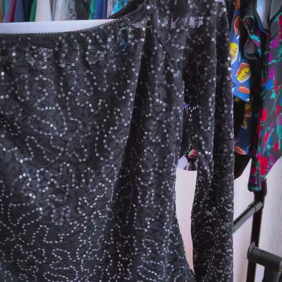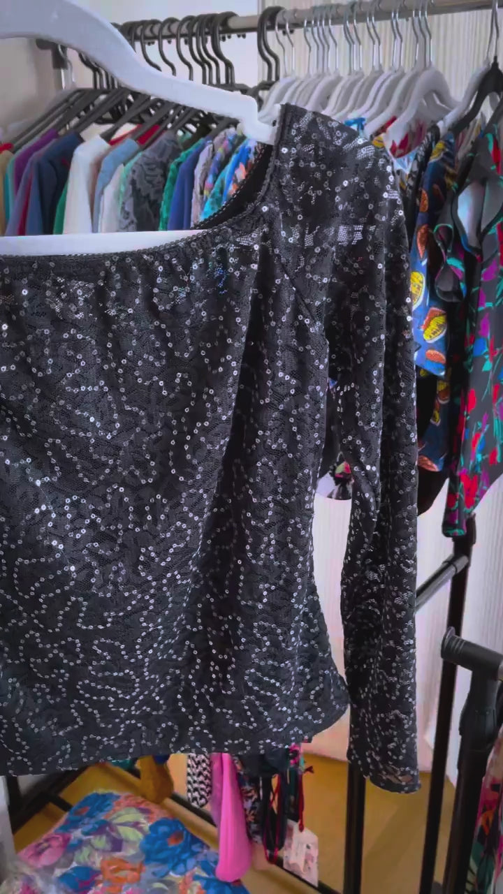 Elegant off-shoulder top made of shimmering lace with soft lining. The delicate long sleeves and subtle sparkle create a refined look, perfect for dancing or an evening out.