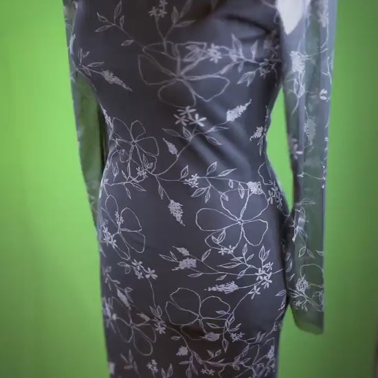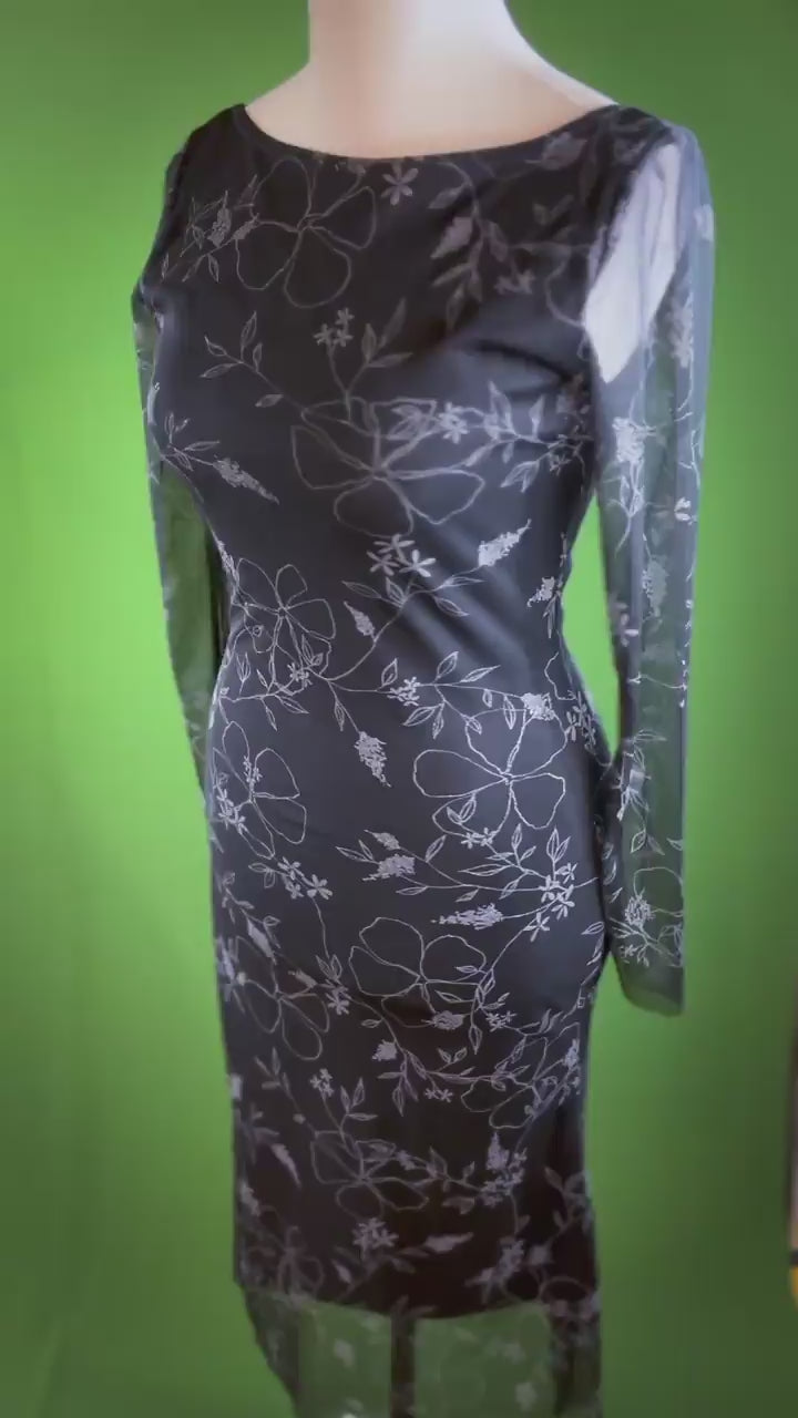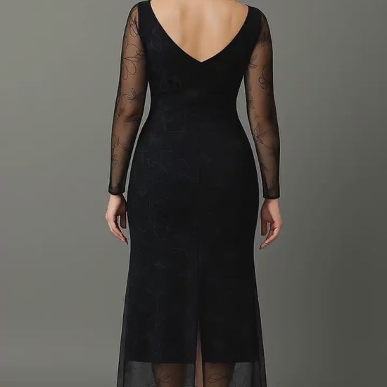An exclusive tango dress crafted from delicate black mesh with a subtle floral print, layered over a soft black lining. The fitted silhouette with long transparent sleeves creates a refined and graceful look, while the semi-sheer overlay adds depth and elegance. A back slit ensures freedom of movement, and the midi length enhances its sophistication. Perfect for special evenings, tango performances, or refined occasions.
