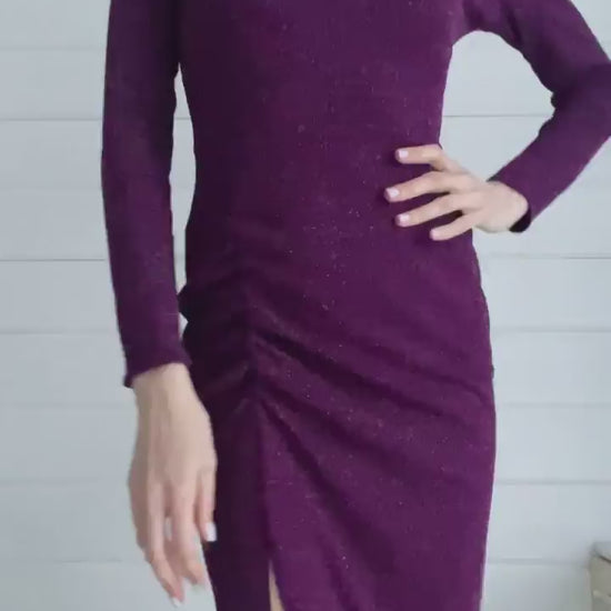 An elegant shimmering jersey tango dress that combines comfort and allure. The fitted silhouette with side draping highlights femininity, while the deep V-back and high front slit add grace and movement. Made of dense jersey that does not require lining, it flows beautifully with every step.