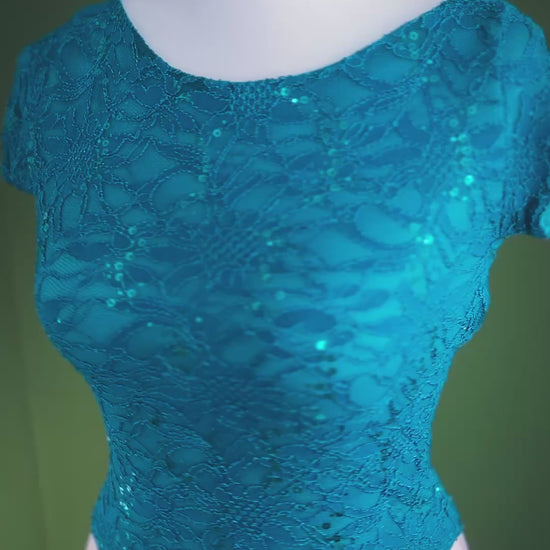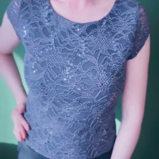 A delicate shimmering lace top, elegant and versatile. The soft lining ensures comfort, while the open back detail adds sophistication. Perfect to pair with skirts or trousers for dancing or evening occasions.