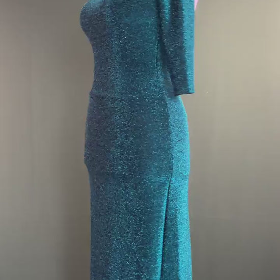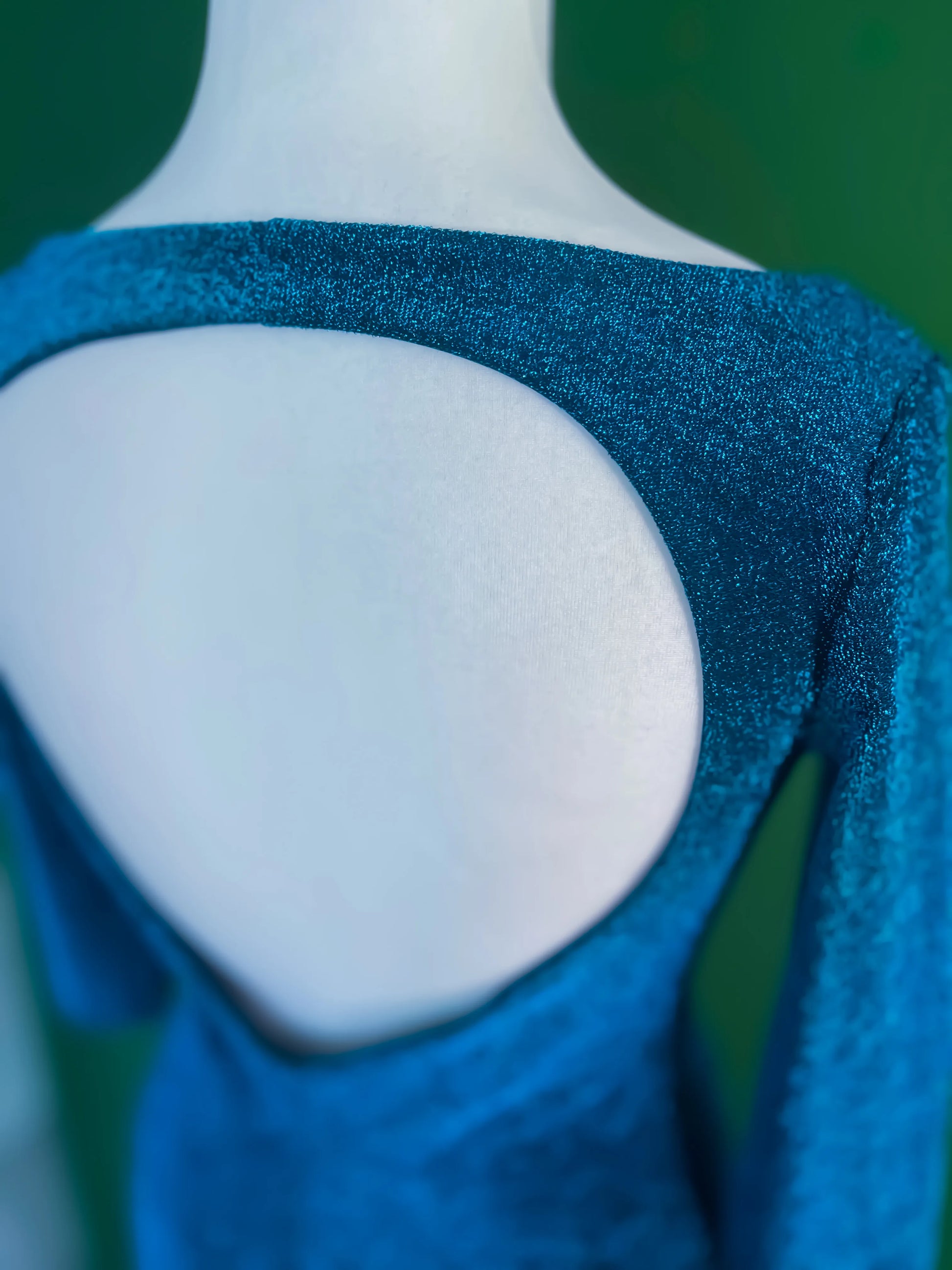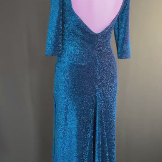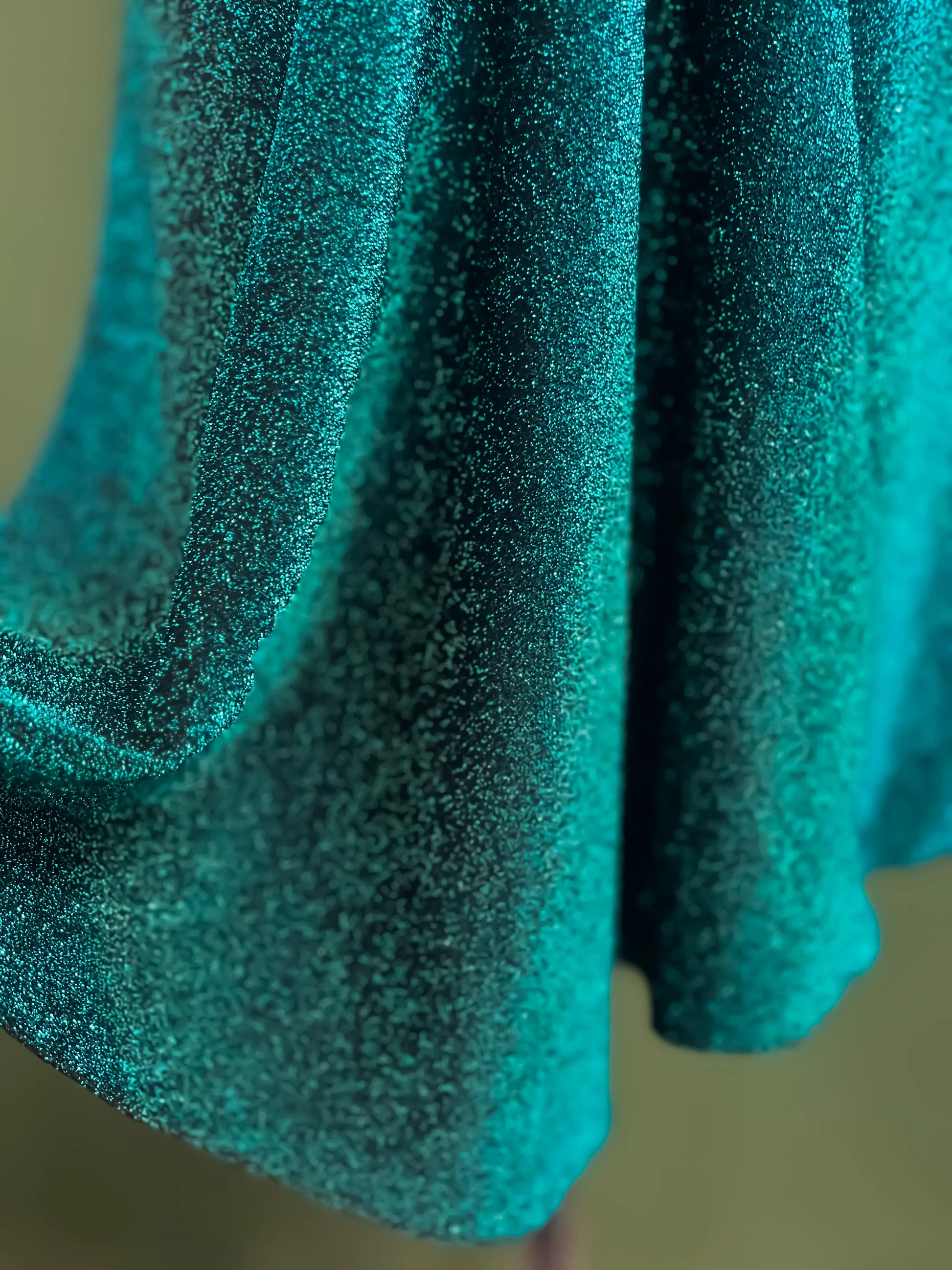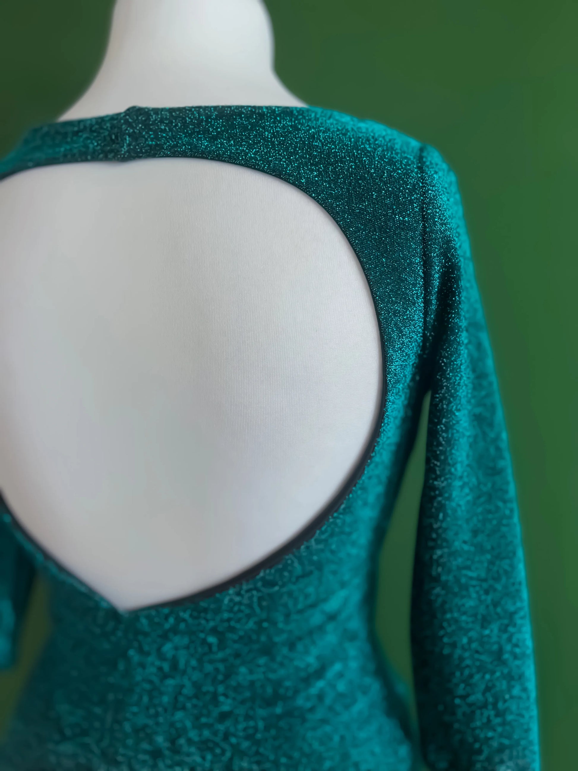 An exclusive tango dress crafted from shimmering stretch jersey with a silky drape, fully lined for comfort. The fitted silhouette features elegant three-quarter sleeves, while the dramatic open back cut adds allure and sophistication. The skirt finishes with a subtle tail, flowing gracefully in movement. A refined design that perfectly balances temininity and stage presence.