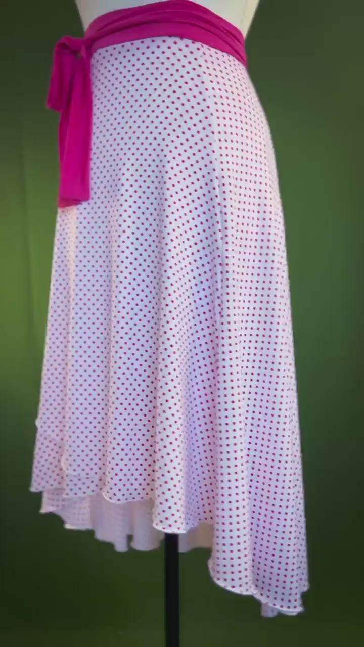 Charming tango wrap skirt in soft, flowing jersey with a delicate white base and tiny pink polka dots. Designed with an accent wide pink tie belt that highlights the waist and adds a playful touch. The asymmetric hemline creates graceful movement, making it perfect for dancing. One of a Kind — One Size
