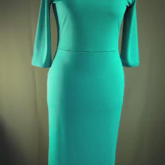 Elegant midi dress with a timeless silhouette, crafted from silky stretch jersey with a soft lining. Featuring a flattering three-quarter sleeve and a back slit for ease of movement.
