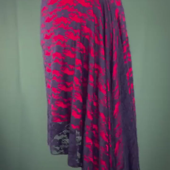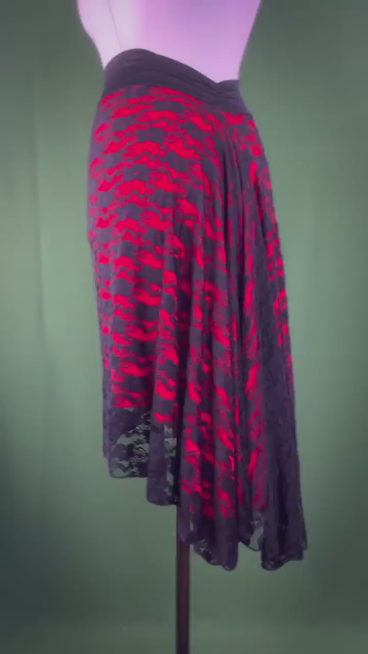 Elegant tango skirt crafted from black lace layered over a red lining in the front, creating a striking contrast. Designed with a small side slit along the leg and a flowing asymmetric tail at the back for graceful movement. The wide black stretch waistband with gathering at the back provides a secure and flattering fit. One of a kind