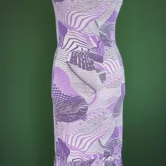 A striking and feminine dress crafted from soft viscose, gentle on sensitive skin. The fitted silhouette enhances the figure, while the flared hemline adds movement and grace. Featuring a rich abstract animal-inspired print in deep shades of burgundy, violet, and olive, this unique piece radiates confidence and allure. Perfect for tango nights, festive events, or an elegant evening out. Only one piece available.