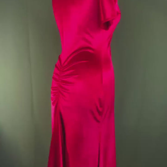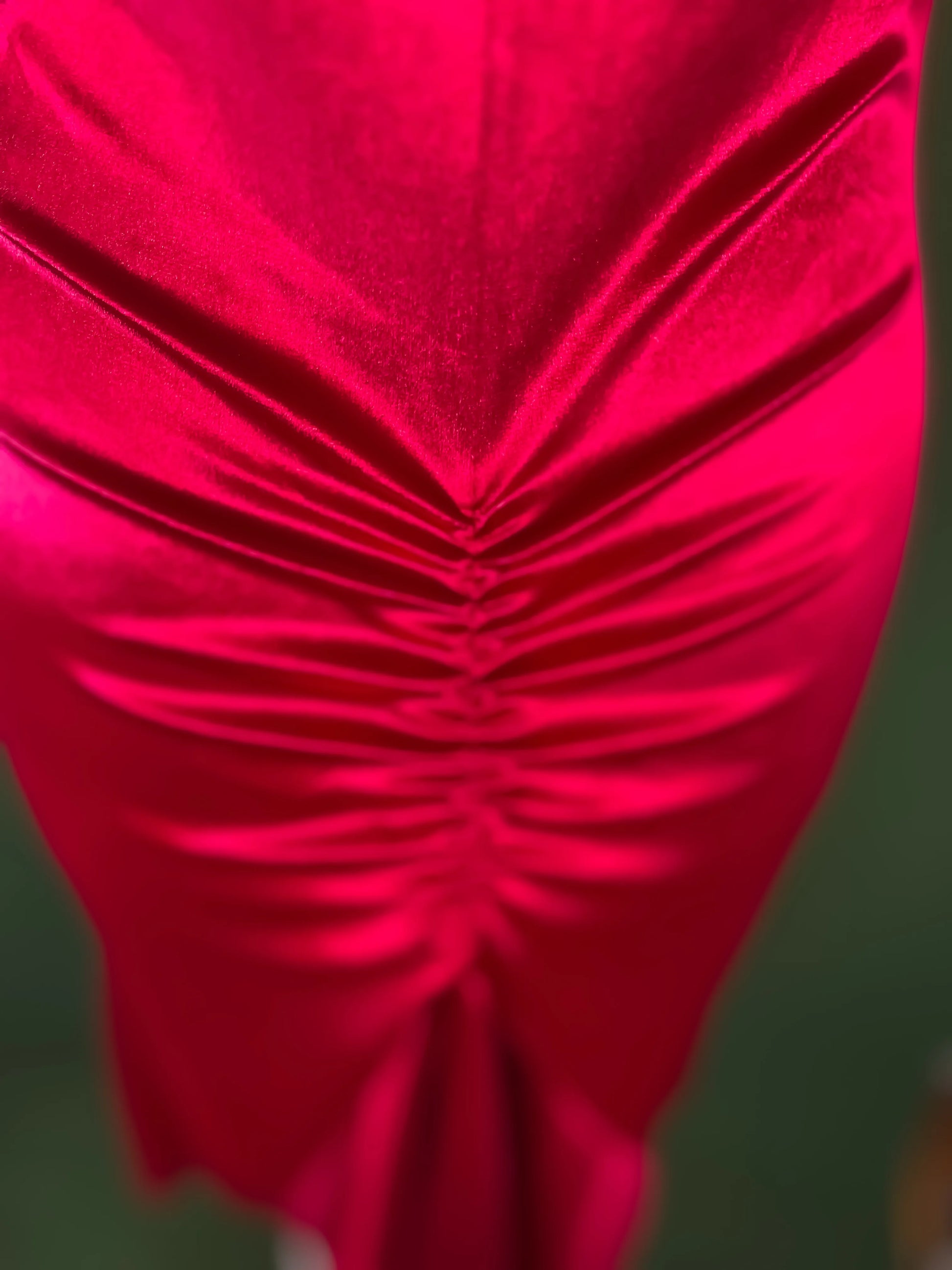 A sophisticated dress crafted from silky velvet, designed with elegant draping on the bust and refined gathering at the hips. The back features a graceful low neckline that highlights the silhouette, complemented by a subtle train effect for added allure. A timeless piece created to move beautifully with you. Limited Edition.