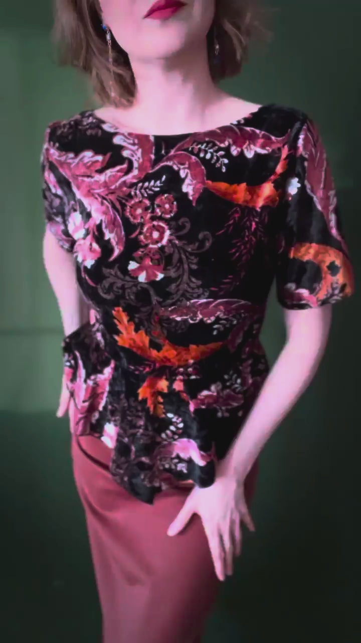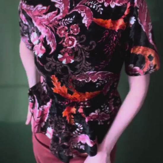 Luxurious and eye-catching, this top is made from silky velvet with a rich ornamental print. The elegant peplum adds movement, while the elbow-length sleeves make it suitable for cooler evenings. A statement piece that combines comfort and sophistication.